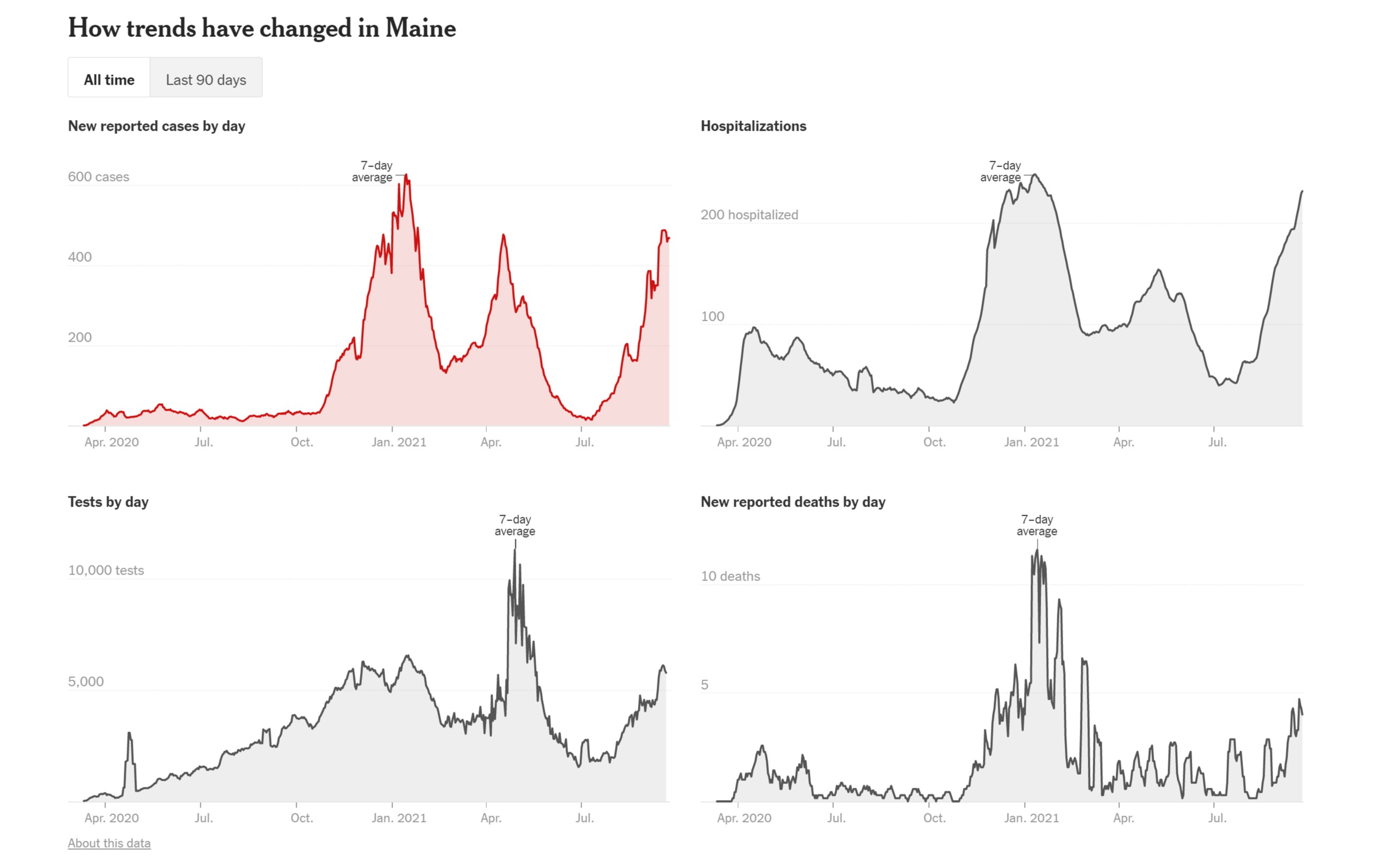 but what we see here is unsettling. new england is still at low absolute rates of death and hospitalization, but they are rising rapidy and are tracking at multiples (sometimes extreme multiples) of last year and cases are exploding even when adjusted for sample rate, which augurs poorly for future hospital and deaths data.