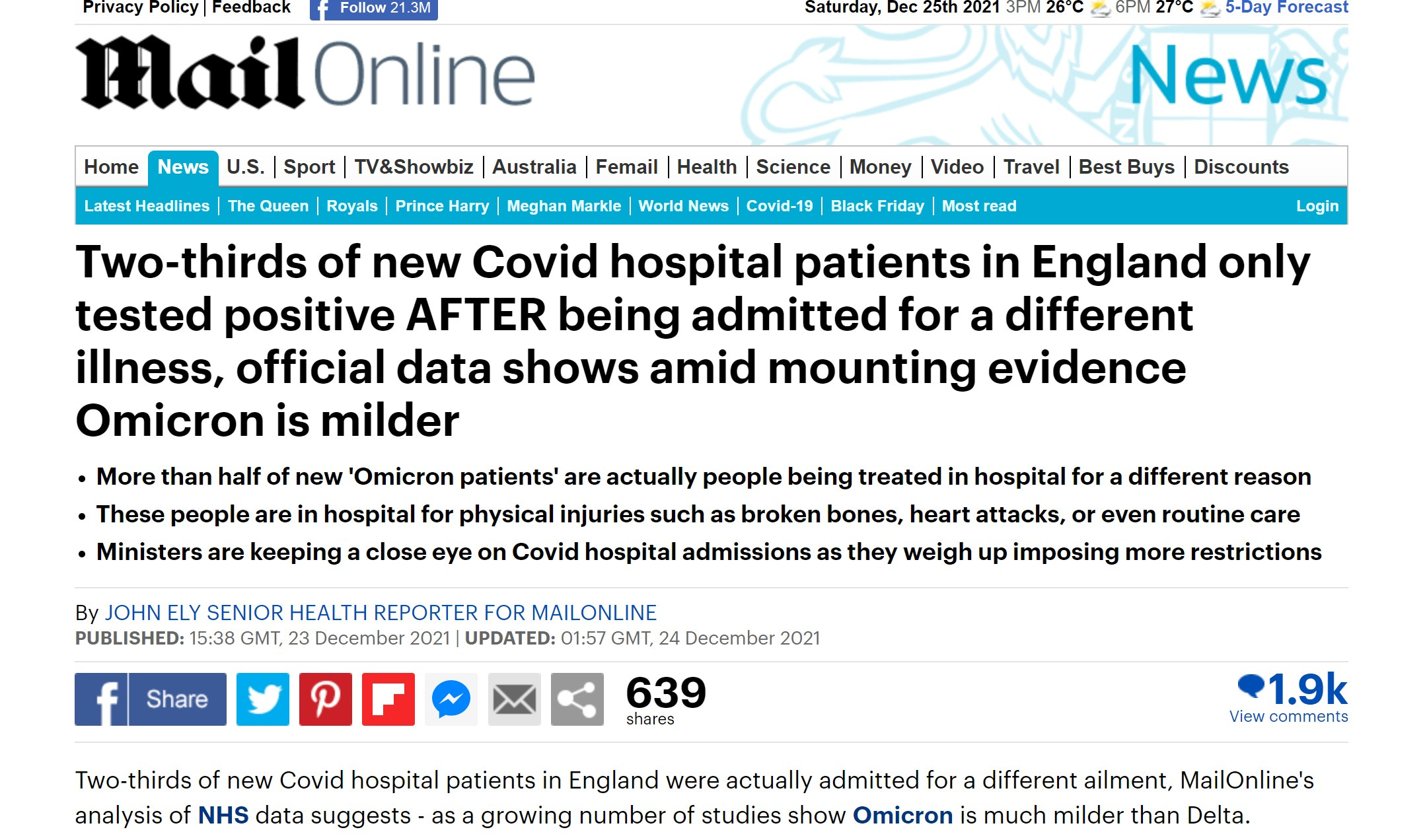 “Two-thirds of new Covid hospital patients in England were actually admitted for a different ailment, MailOnline's analysis of NHS data suggests - as a growing number of studies show Omicron is much milder than Delta.