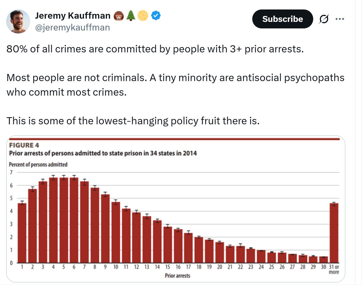 and the solution is actually easy because the problem seems big in terms of number of crimes, but it’s actually tiny in terms of the number of people committing them. they are serial offenders with always on recidivism who will not or cannot learn or change.