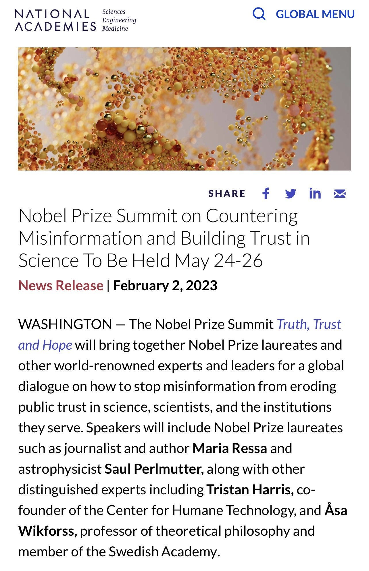 “At the summit, Nobel Prize laureates and other experts will be joined by information technology and business leaders, policymakers, journalists, educators, and youth from around the world for a global discussion to explore solutions to actively combat the spread of misinformation and disinformation, share evidence-based knowledge and global experiences, and help restore confidence in science and systems of society.”