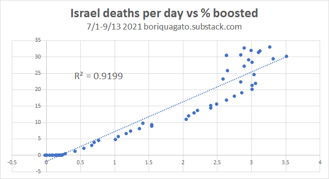 interestingly, this correlation tightens when we shrink the interval to 14 days (the period that showed negative rather than merely reduced VE in the danish study) though the recent divergence is also greater. (both charts are 7/1 to 9/13)