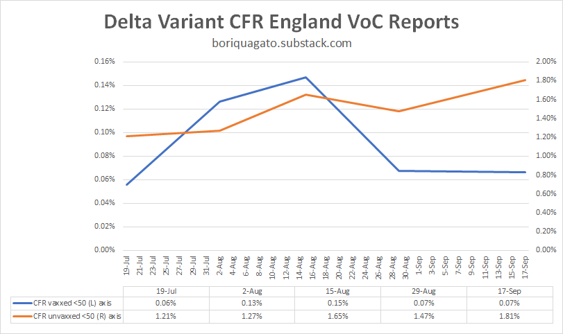 we can see similar in the under 50’s, though the data here is a bit of a mess as during this period, so many very low risk under 50’s (those under 18) got vaccinated that it moved a material risk profile reduction from unvaxxed to vaxxed. i suspect that is why “CFR vaxxed” dropped. it was not vaccines working, it was the vaccinated category being “salted” with large number of the lowest risk folks around. (it also means that group left the unvaxxed, so you get an effect on both)