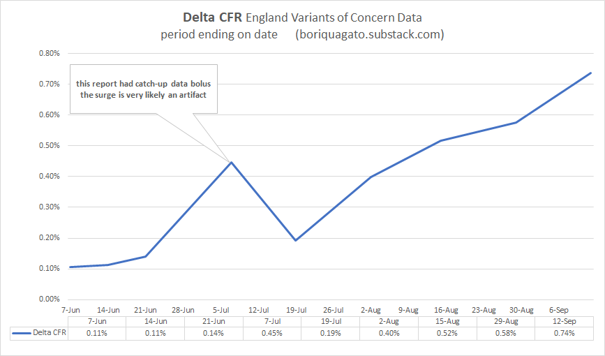delta is rapidly approaching alpha (1.1%) in terms of CFR whereas it used to be 90% lower. (it also means that the reports on delta CFR in these VoC updates are FAR too low because they are a blend of all cases and deaths back to feb, so they are averaging in the low CFR past and are slow to respond to current dynamics)