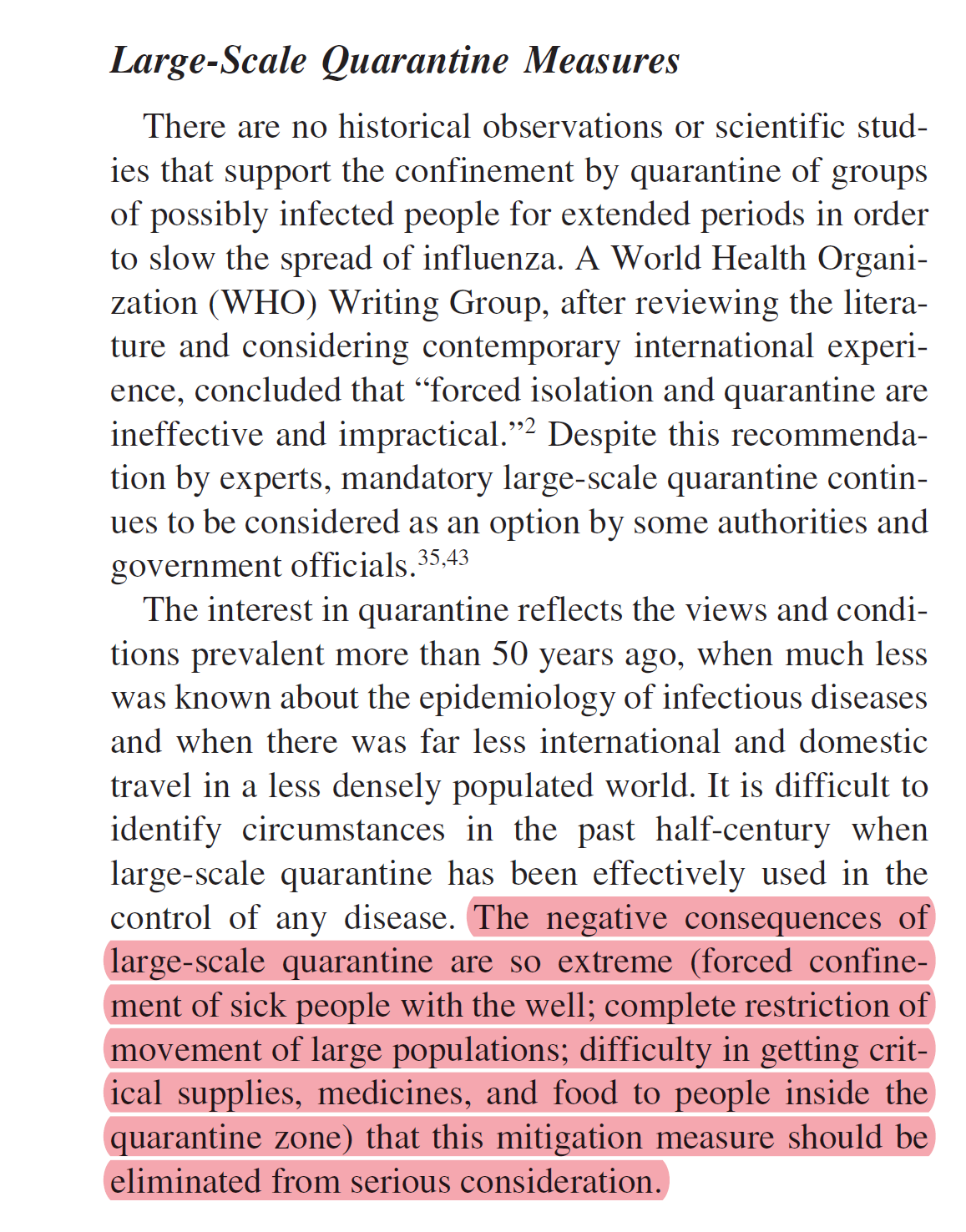 it’s painfully obvious in all the data that the pre-existing guidelines were 100% correct right down to predicting the manner in which politicians would panic and try to do the wrong thing. THIS is from 2006 and was published in “biosecurity and bioterrorism: biodefense strategy, practice, and science.” not exactly a pop journal but one that is influential in the policy circles that should have know better on covid.