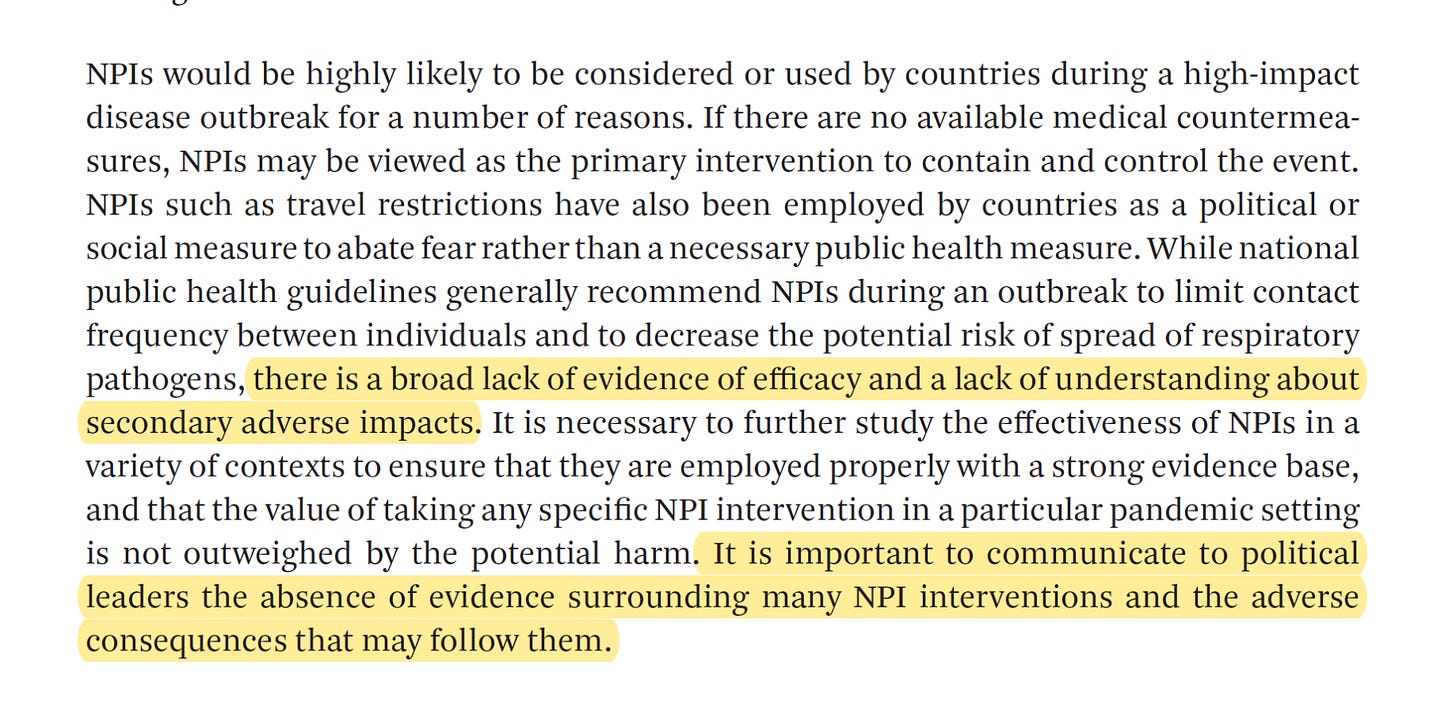 so read ALL claims about masks and lockdowns and travel bans and all other kinds of NPI with real skepticism. they are not nor have they ever been the “base case.” they are a reckless devolution into epidemiological adventurism and their price has probably exceeded any non-wartime policy in human history. they addressed a problem that was not really a problem. they were the equivalent of france trying to keep the germans out by fortifying normandy. it’s not just that they did not work, it’s that there was nothing for them to work on. that was never how covid spread.