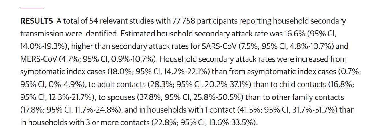 this is striking data. for those not well versed in the terminology, let me translate a bit: this is measuring secondary attack rate in households. secondary attack rate is the likelihood that one infected person will pass the infection on to another person who is exposed to them. if it’s 100%, you’ll give it to everyone, every time. if it’s 0%, it will not spread. the SAR for SARS-2 covid (admittedly a confusing confluence of acronyms) was 16.6%. so, 16.6% of people in any given household could expect to be infected if one member of the household had covid. OK.