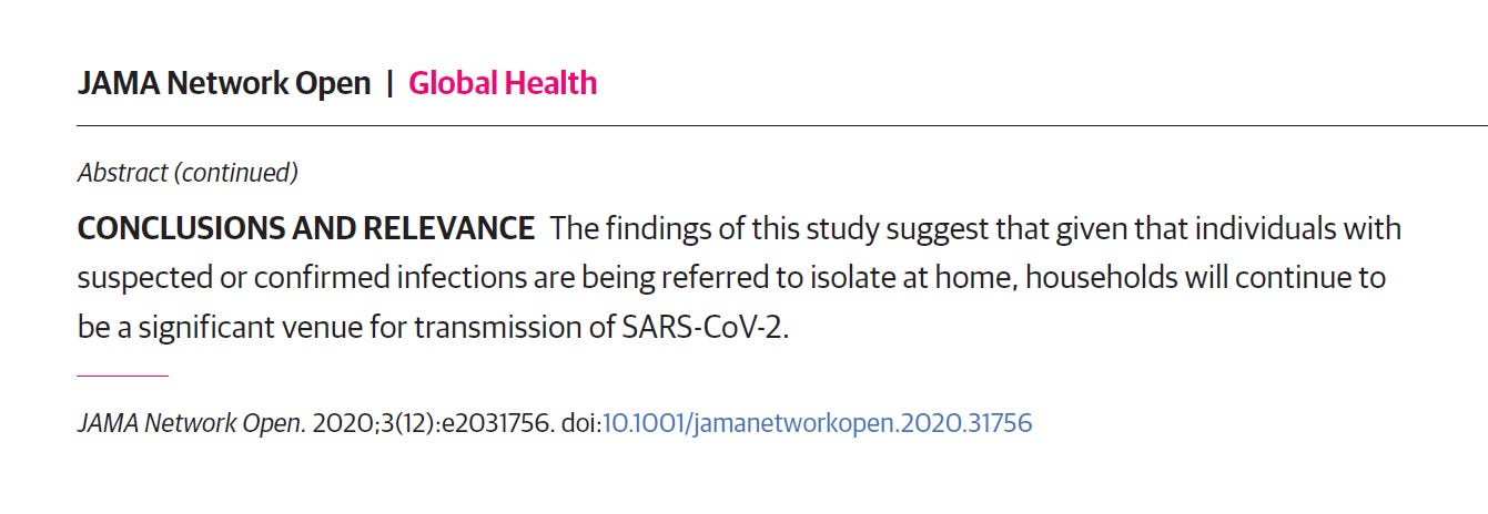 where this gets interesting is in the subset analysis. they then split the infected cohort into 2 groups: those with symptoms and those without. the variance turns out to be massive. symptomatic carriers had an SAR of 18%. asymptomatic carriers had an SAR of 0.7%. not only is that a nearly 26X variance, but it shows that the likelihood of an asymptomatic carrier spreading disease to you is less than 1% overall even in what looks to be one of the highest risk vases around: living together. this is long exposure in enclosed spaces with shared food, bathrooms, cooking facilities, and who knows what else. spouses had 37.8% SAR vs 17.8% for rest of family, so clearly, sleeping in the same bed and physical intimacy are likely big risk factors affecting overall SAR. but even despite ALL that, SAR for asymptomatic is sub 1%. this is a major finding. and the authors more or less buried it. (perhaps this is why the CDC allowed this study to be cited) the author’s conclusion was this: