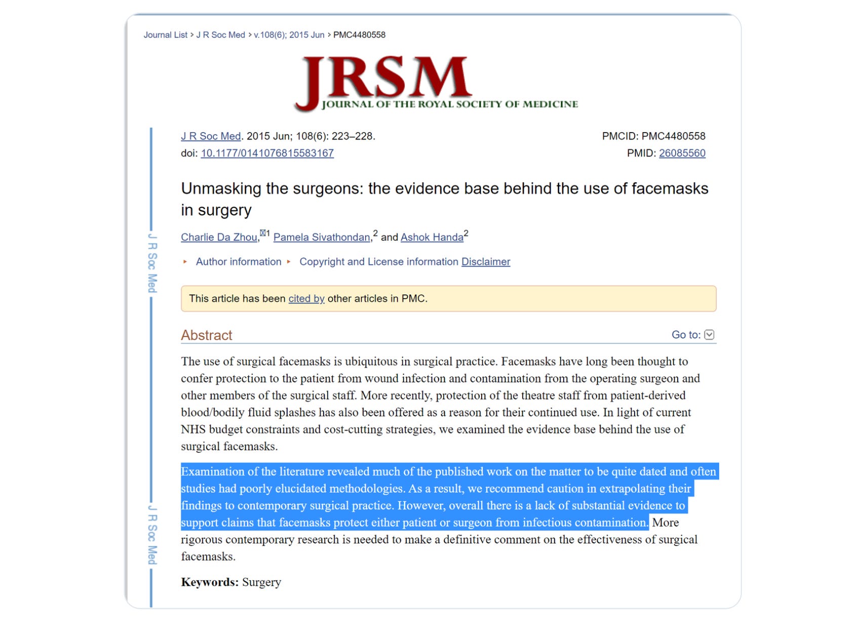 but because “2020” this became canon. so many outlandish things did and so many were clearly the output of a fear driven moralizing engine, not of any sort of process grounded scientific method. it was clear that “wear a mask to protect yourself” was never going to cut it as social prescription. it’s an individual choice based on personal risk assessment. to force such a mandate into the collective demands a collective idea like “source control.” “your mask protects you” cannot drive a sanctimonious in-group vs out-group conflict but “your mask protect me” can. so they invented this claim out of whole cloth. it never had ANY basis in fact, it was just a social trope generated to fit social need and plucked from the instant A/B testing of the social media lab as proven propaganda. many science-fair looking “proofs” were ginned up in labs with mannequins and cough tests. none had the slightest clinical relevance and as we saw above, all were pointed at a “problem” so minor that solving it accomplished essentially nothing anyway. worse. all ignored that which did have real clinical relevance: studies on source protection. masks do not stop source spread of infection even when used by trained surgeons in operating theaters.