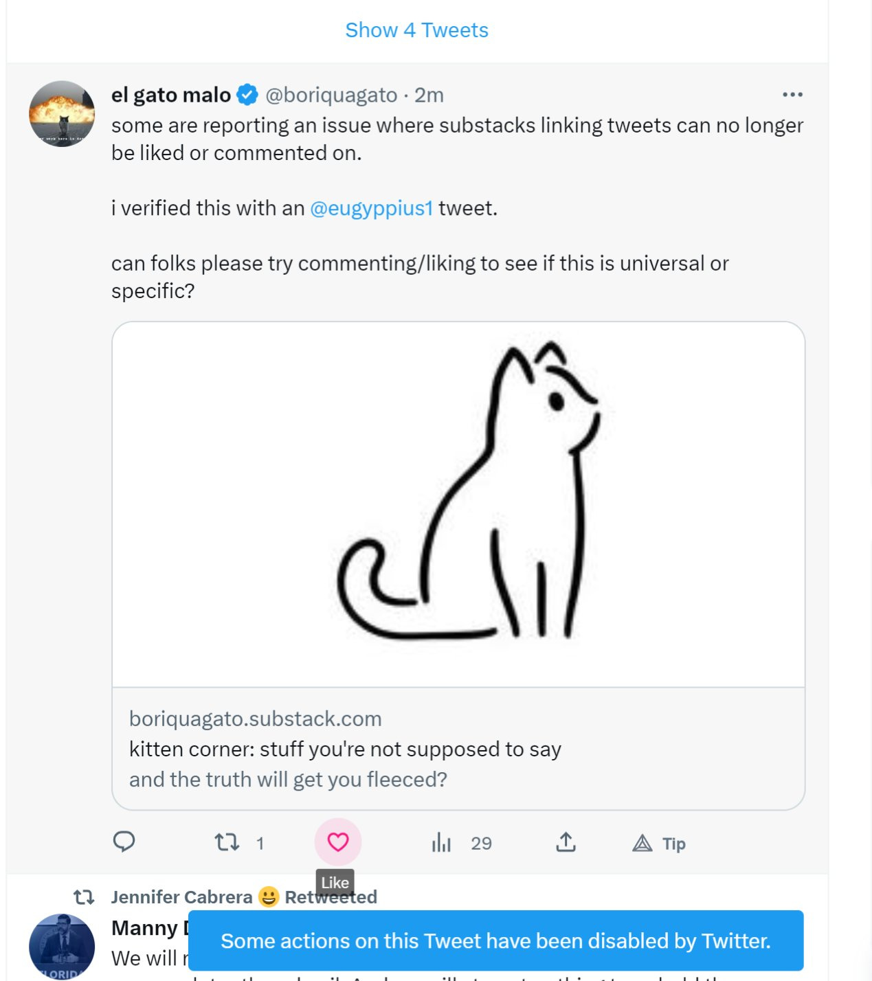 apparently, any tweet with a link to a substack in it can now no longer be liked, commented on, or re-tweeted.