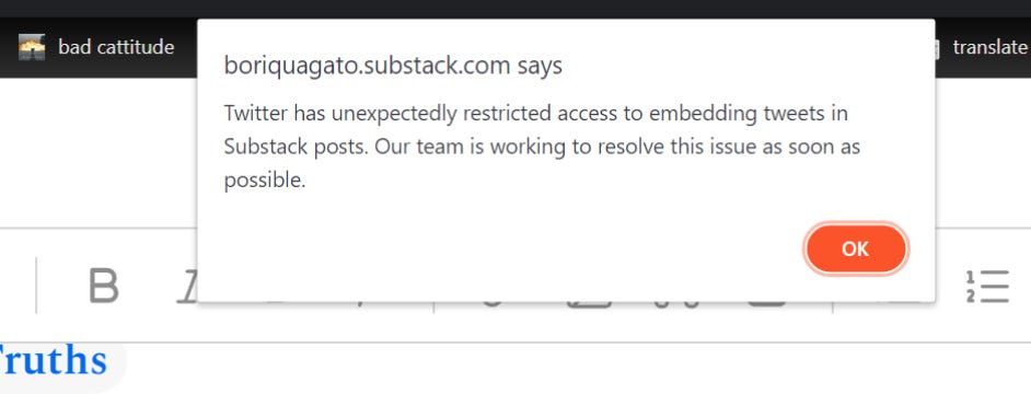 based on the fact that one can no longer embed a tweet in a substack, it seems like this is bullying bluebird belligerence.