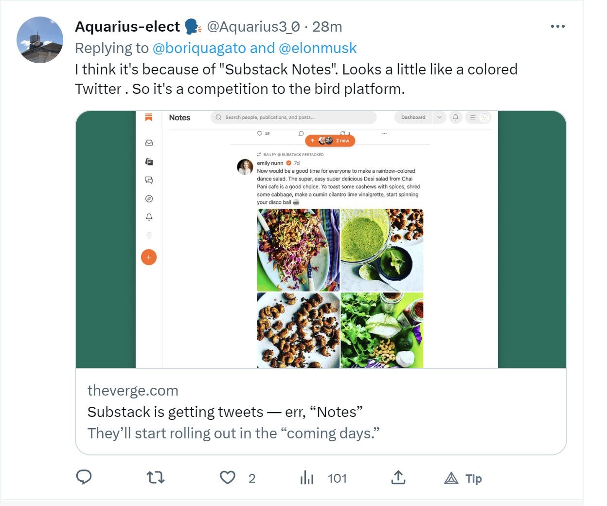 some are saying this is a response to the impending launch of “substack notes” and that does not seem implausible.