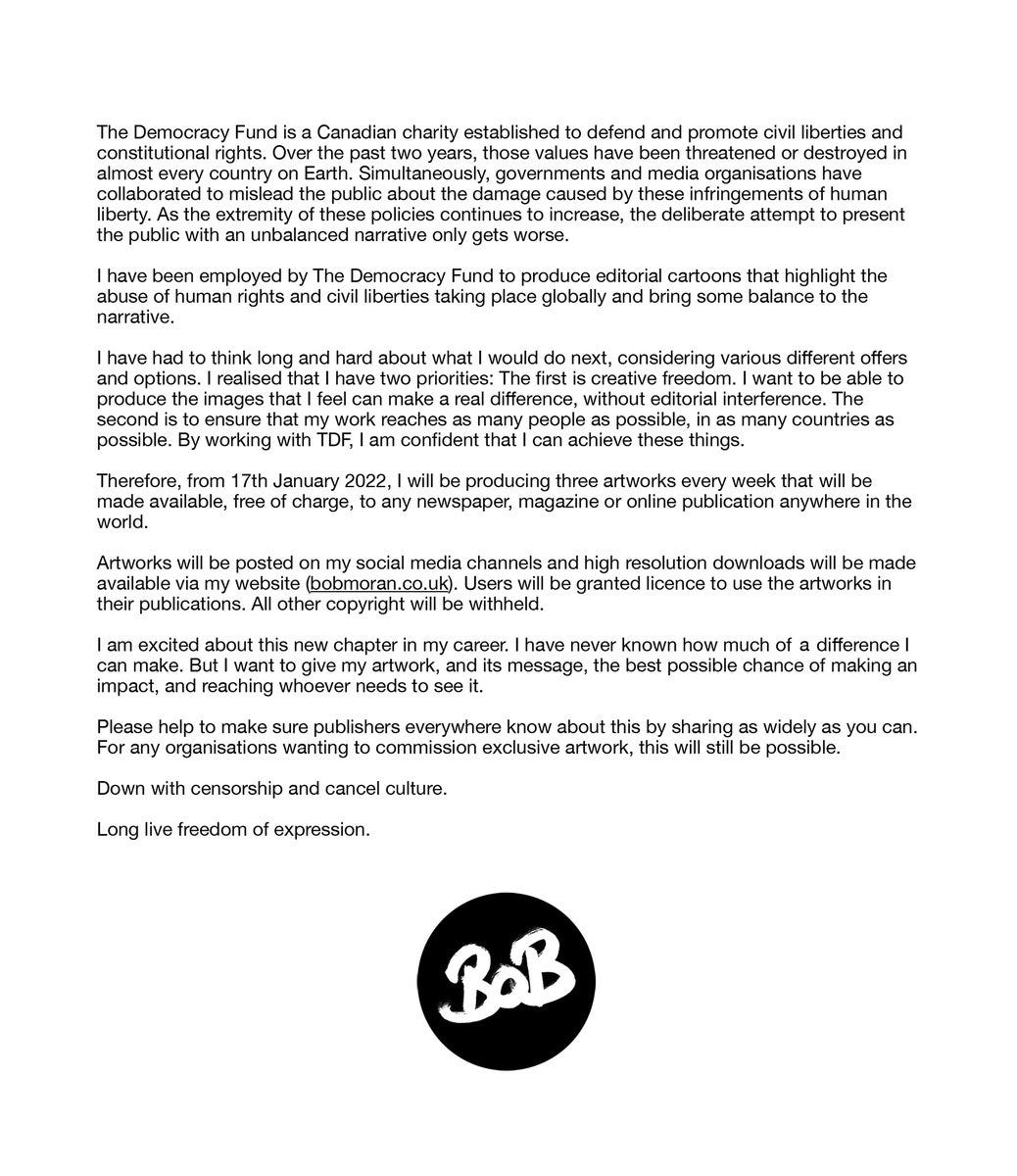 Bob has been a fantastic voice for freedom. First saw his work on Lockdown Sceptic. He's a huge asset to The Democracy Fund and to the Cat.