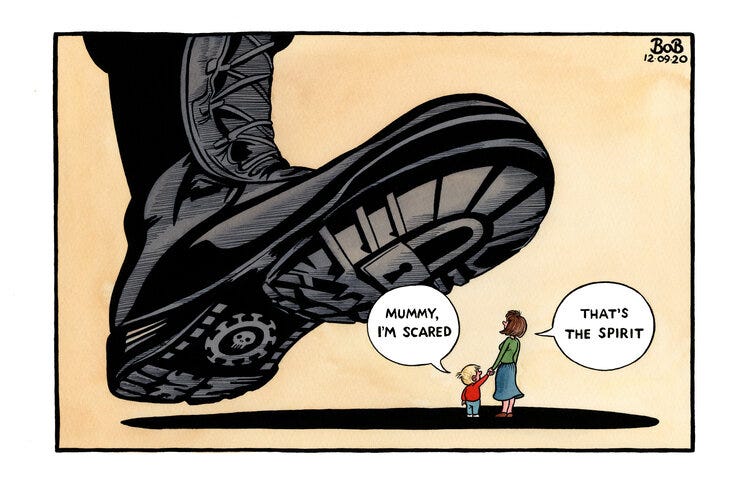 Bob is such a talent, what a joy to have him on our side. I think my favourite of his is 'stab vest' https://www.bobmoran.co.uk/prints/stab-vest