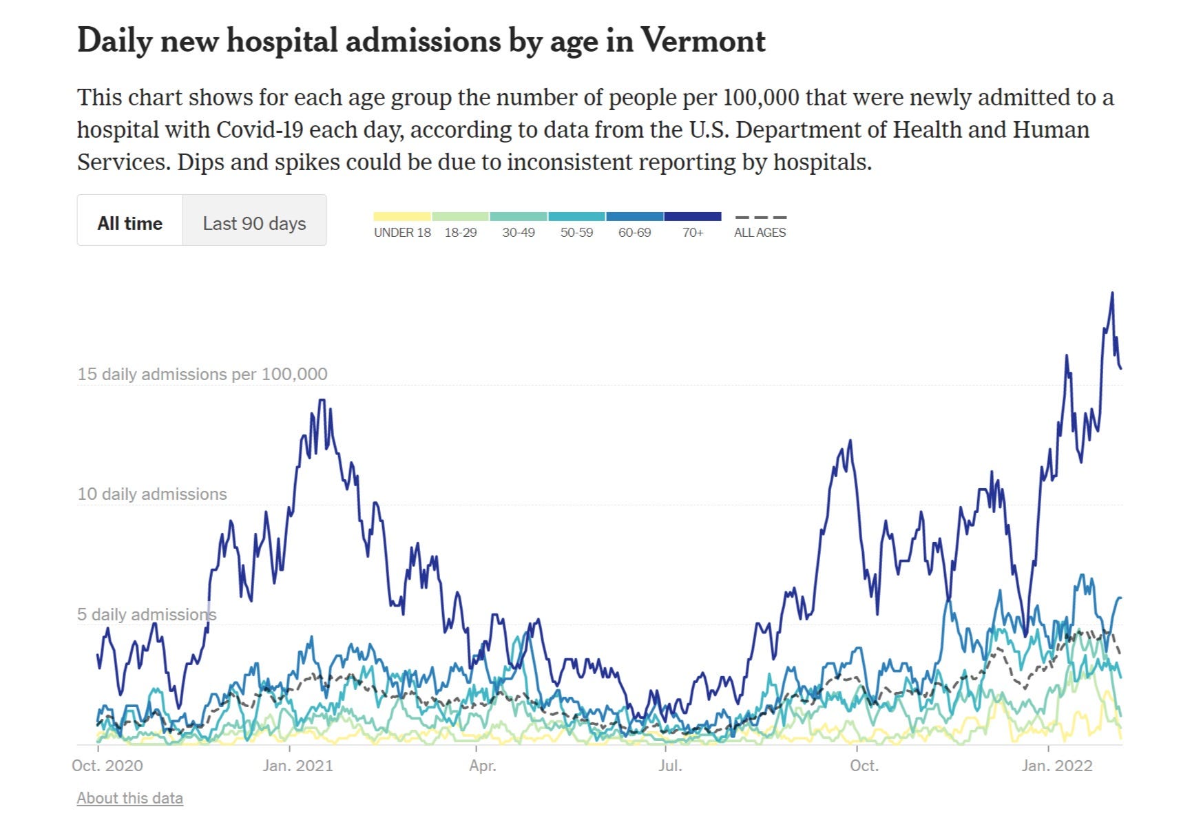 this is a seductive story to tell yourself, but this too is falling apart and looking more and more like wishful thinking and self-justifying confirmation bias. the american northeast pretty much all looks like this with age groups that have 95%+ fully vaccinated status making new highs in hospital admissions for covid.