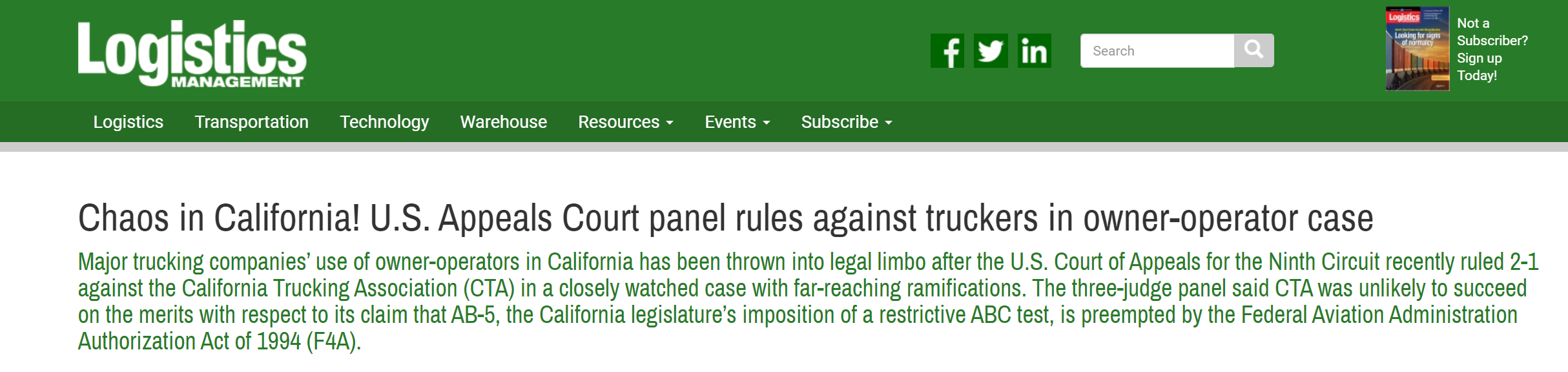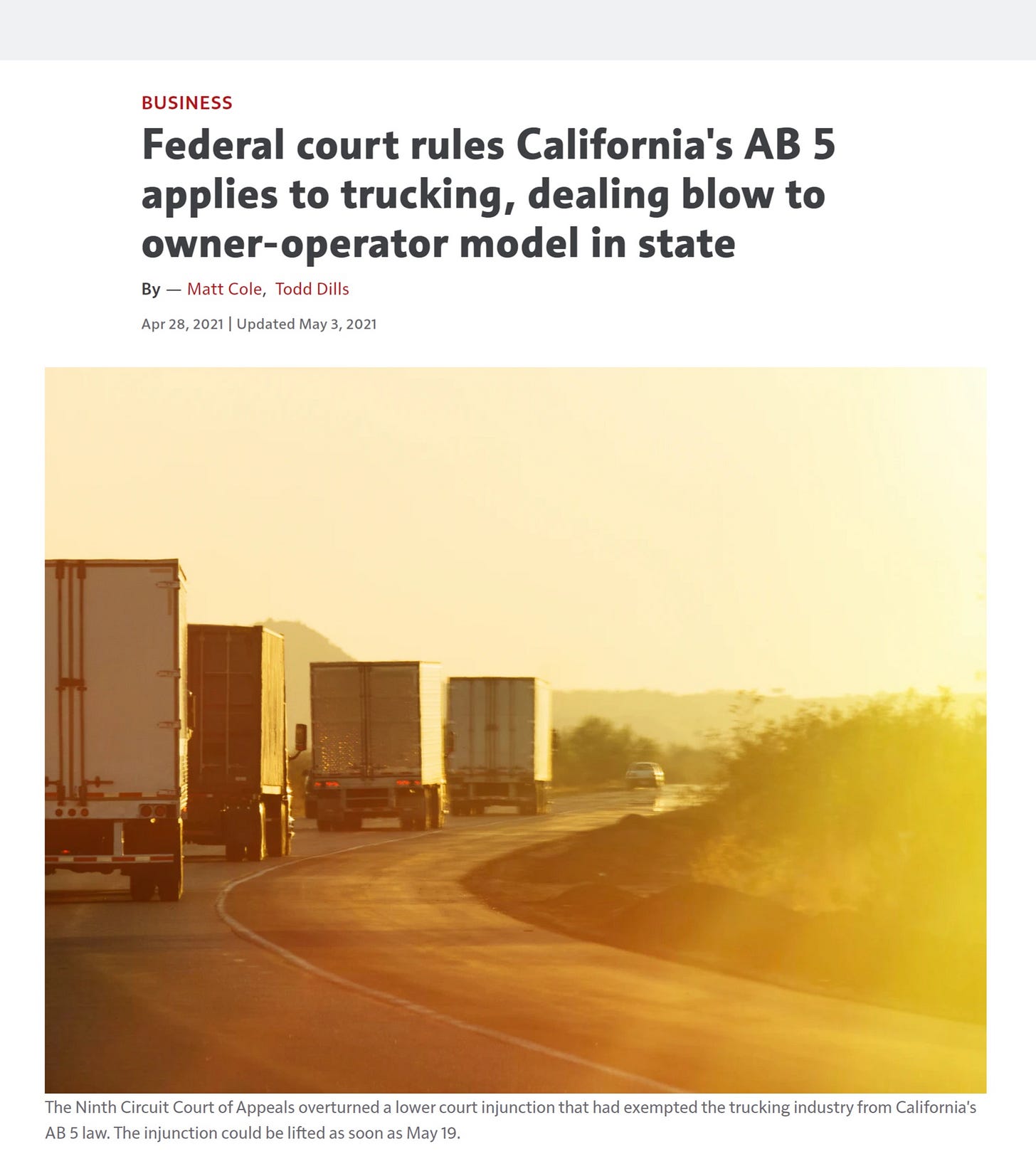 THIS happened back in april. AB-5 is the same rule that prevented uber and lyft drivers from being “contractors” and made them “employees” instead. an exemption was made for owner-operators of class 8 (and other) trucks. that exemption was struck down.