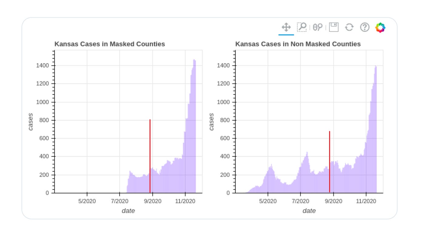 chastened from getting caught sundancing, the CDC sought to move to a “controlled” study. they then published the now infamous “kansas counties” study comparing masked counties to unmasked. this one was an outright lie.