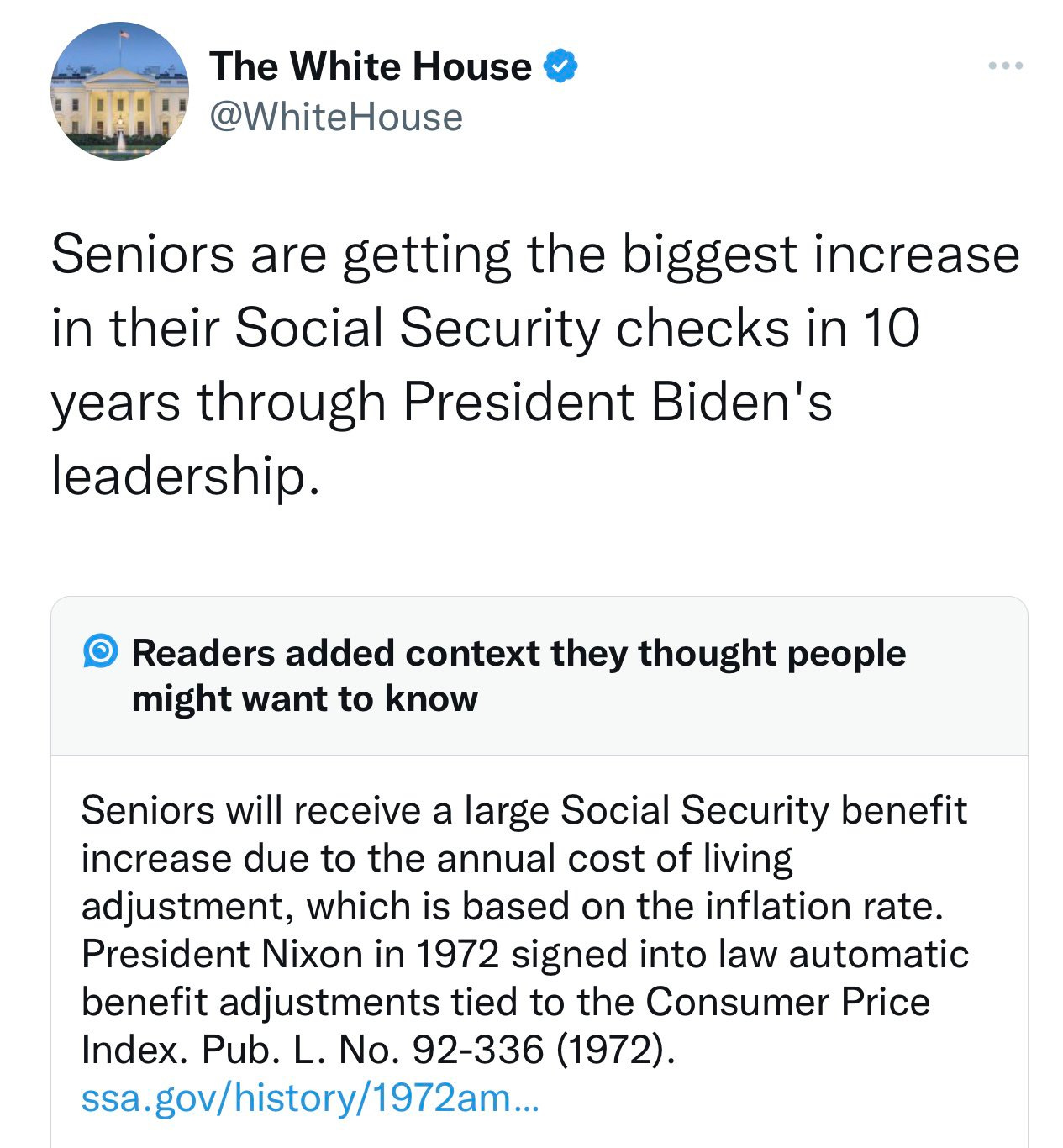 while, obviously, this is a power that could easily be abused and that certainly has been in the past (as well as selectively applied for partisan purpose) i think one would struggle to claim that this was anything other than a straight down the middle, neutral addition that made it clear the manner in which the claim that this completely automatic and formula driven COLA increase in SS payments based on a law put in place in 1972 was some sort of “biden leadership” was pretty disingenuous.