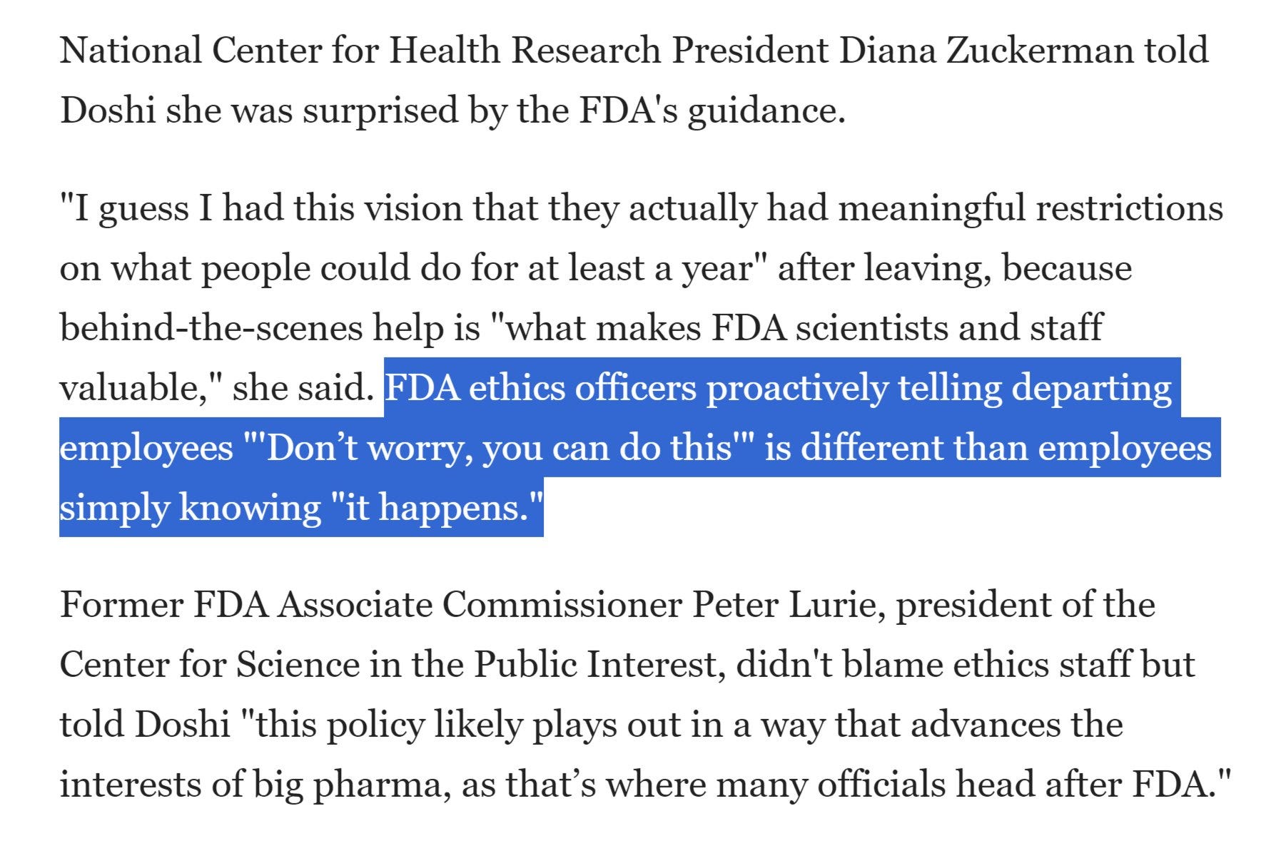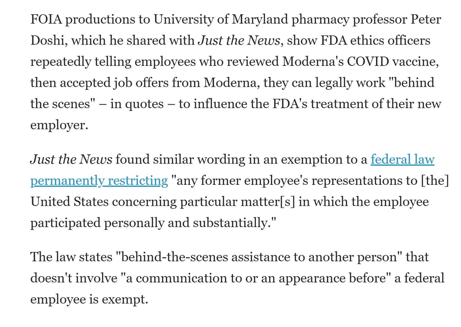 former FDA employees that helped review the moderna covid vaxx application are fine taking jobs at moderna afterwards so long as they only work "behind the scenes" to influence FDA.
