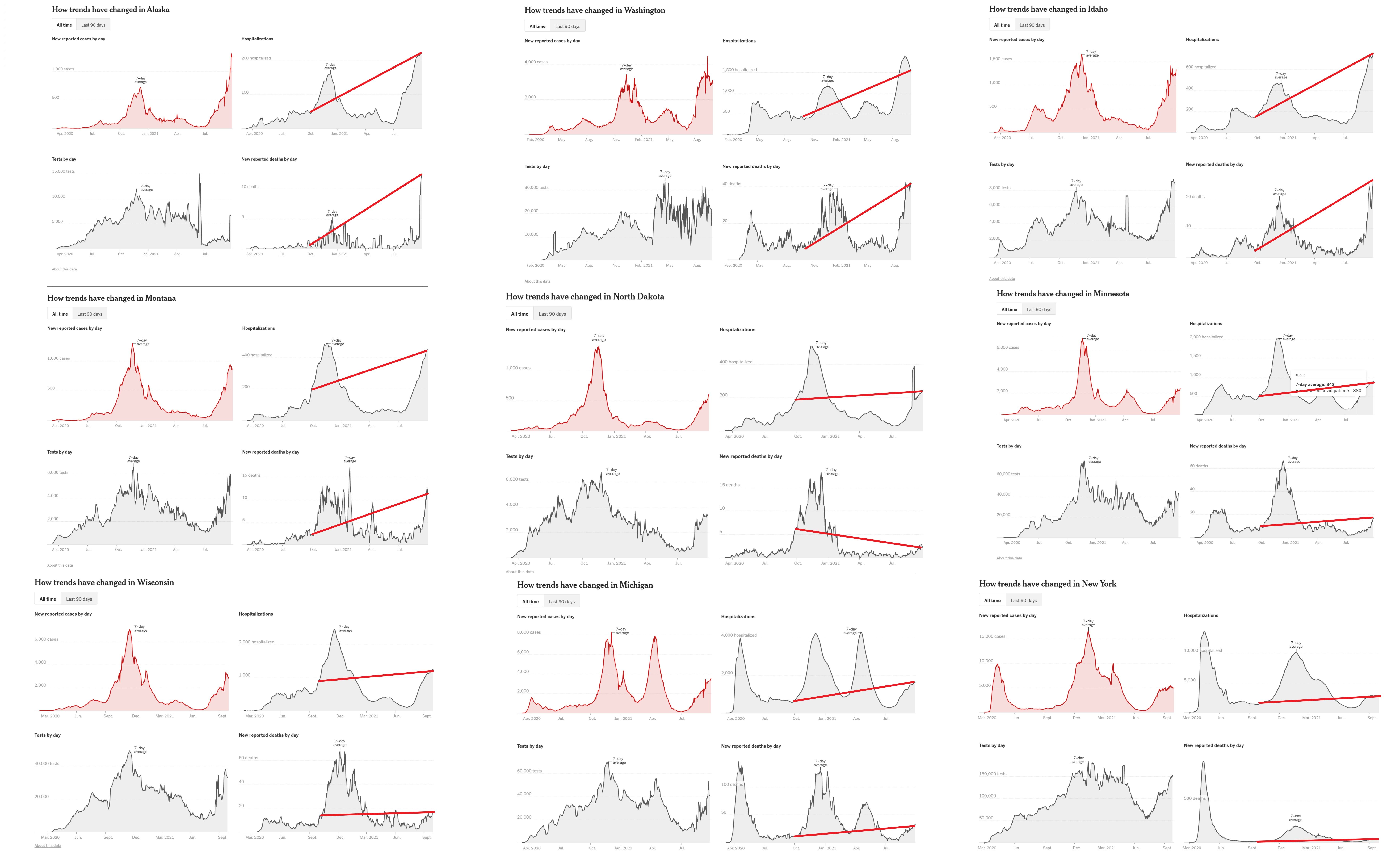 the red lines are hospitalizations and deaths on 9/29/21 (most recent data) vs the same day last year. all are 7 day moving averages to avoid day of the week fluctuation issues and to smooth the trends. data from NYT.