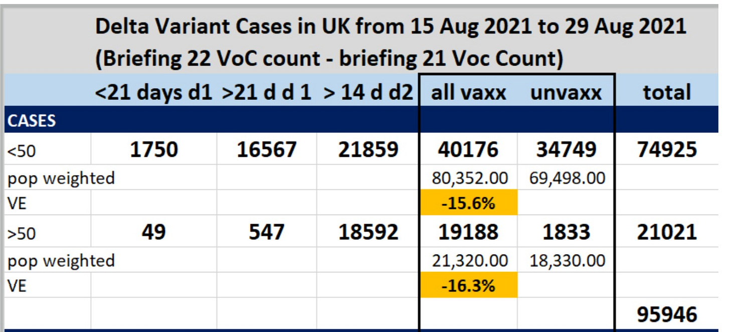 vaccines show efficacy in reducing hospitalization and death for delta but, based on the last 2 week interval in the UK variants of concern reporting, the negative VE looks to be about -16% for cases.