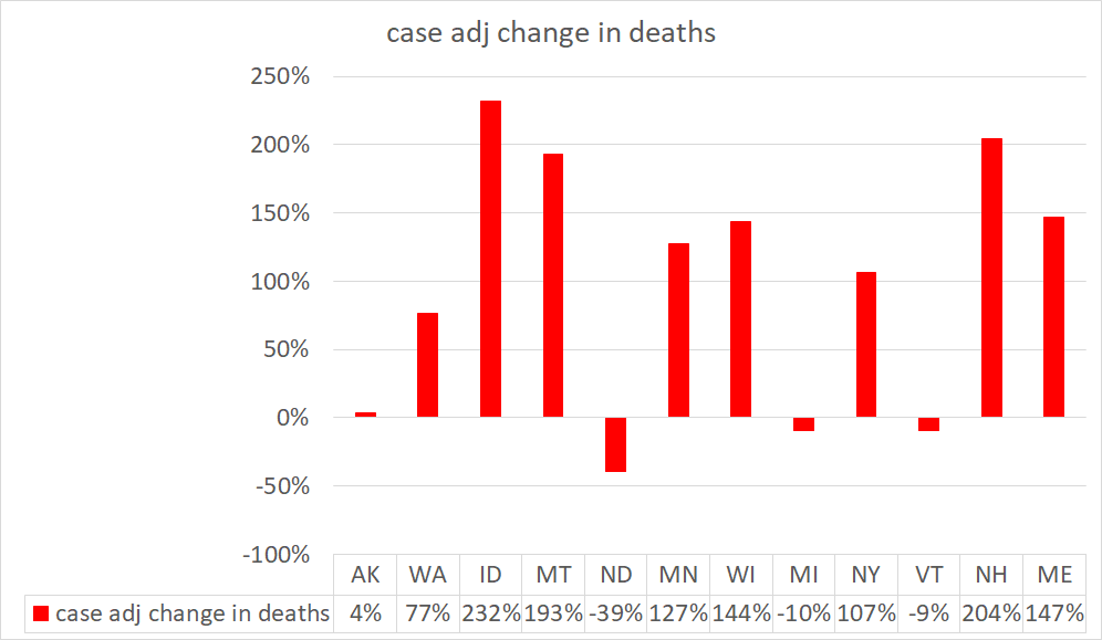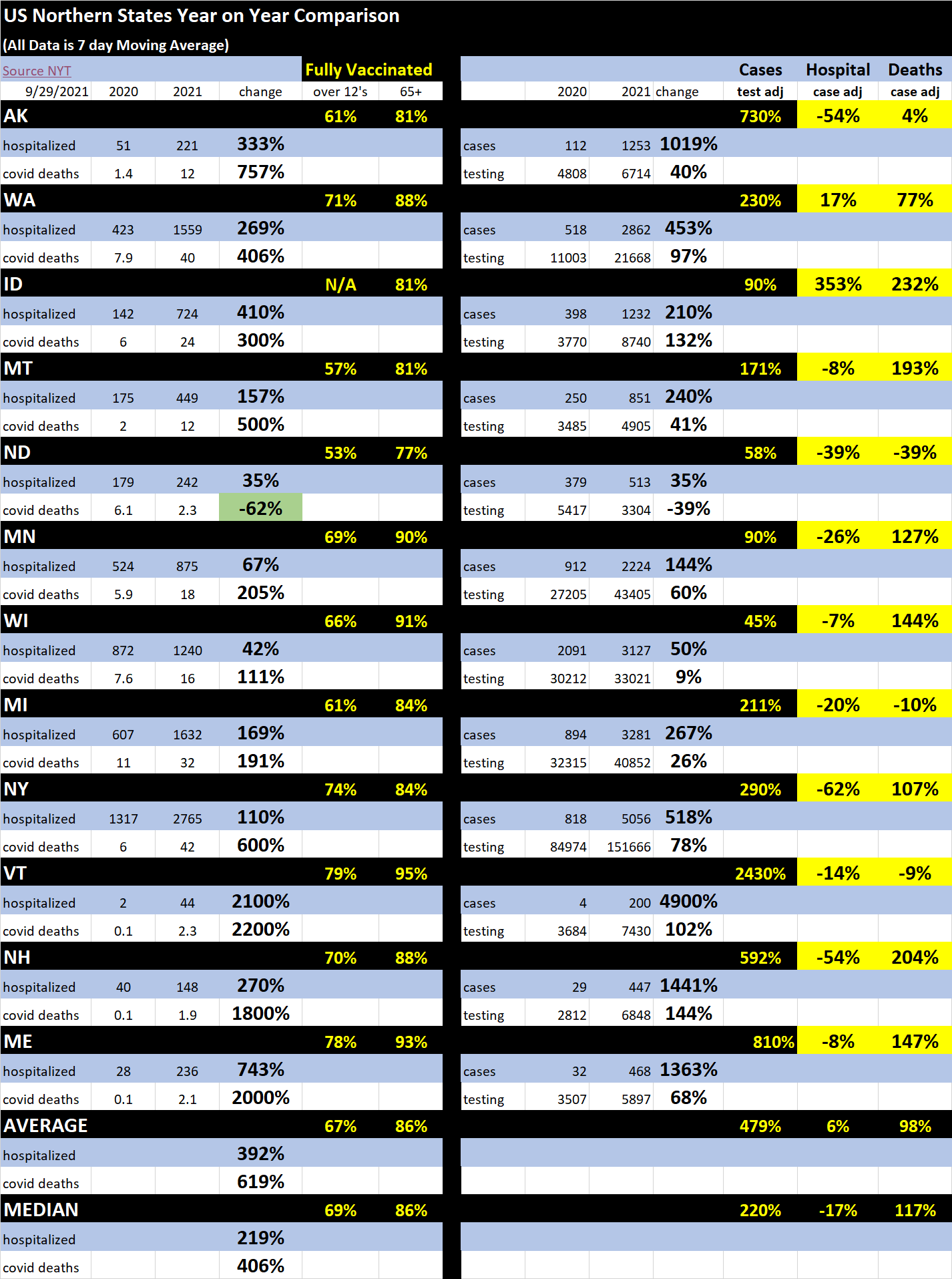 deaths are also up YoY in all states but north dakota. vermont and maine lead the pack at up 2200% and 2000% respectively. (albeit off low bases)
