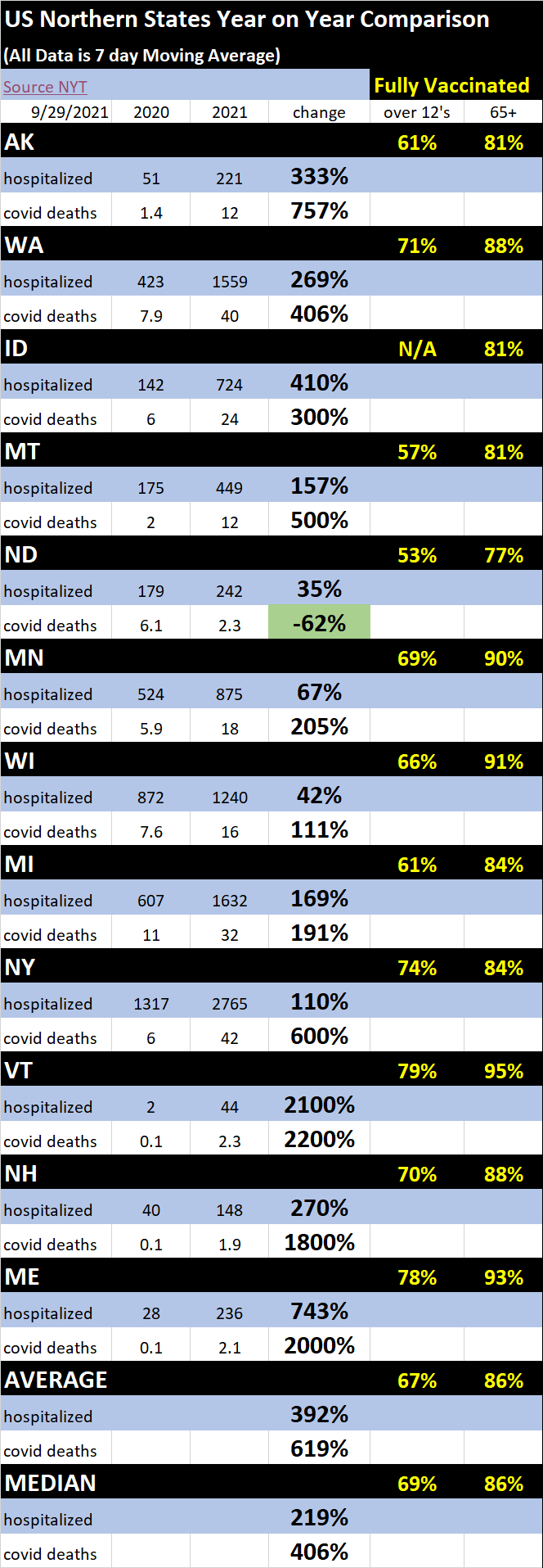 as can be readily seen, this does NOT look good vs a year ago. in every single state on the northern border, hospitalizations are up from last year ranging from up 35% in north dakota to a whopping 2100% rise in vermont.