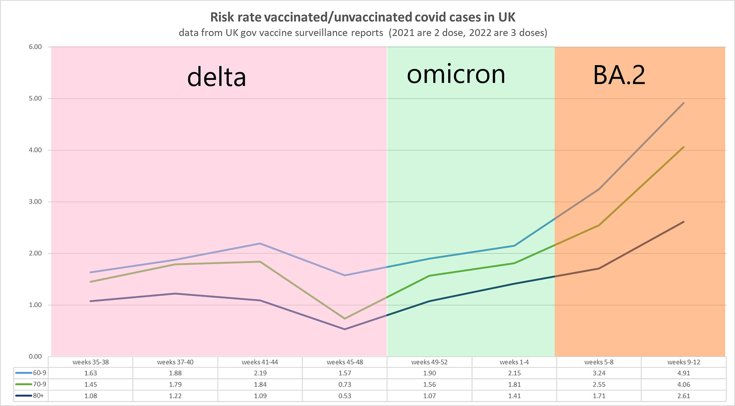 omicron started looking bad for the the older groups and reversed the trend, but BA.2 really blew them out. the rise in risk rate from feb to march has been extreme.