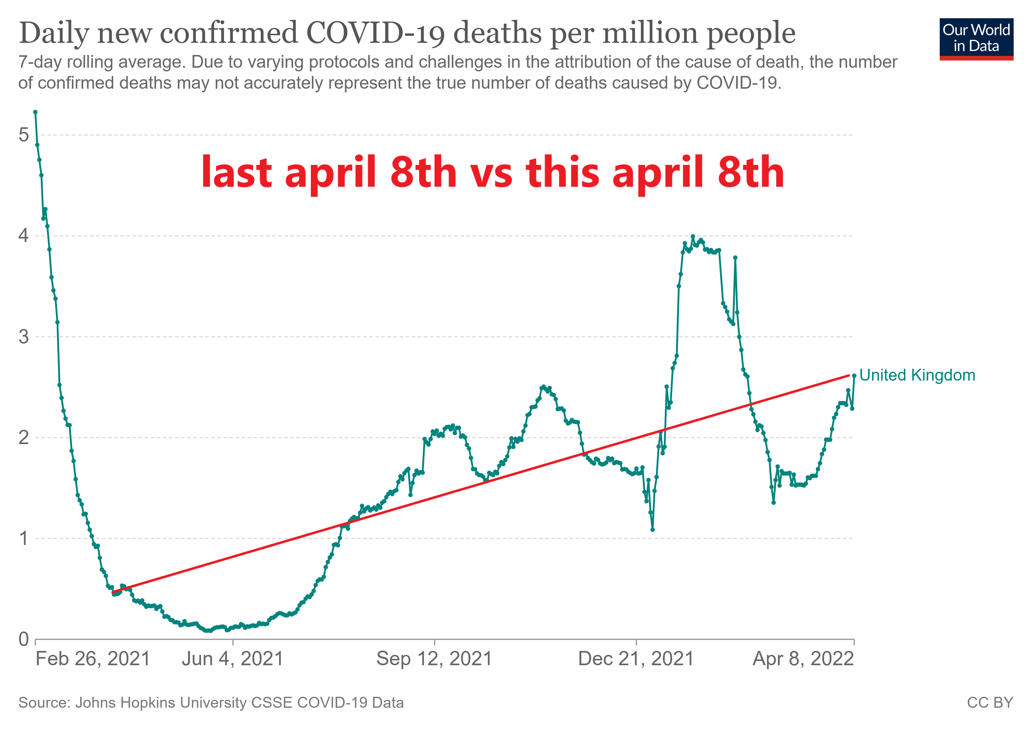 this is leading to an out of season rise in covid deaths in the UK with deaths per day at ~6X the level of the same date last year and rising when last year was falling into a summer trough.