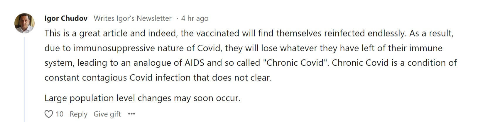 i’m not sure i’m quite ready to sign on this far yet (or that i understand this idea of an AIDS analog), but i cannot dismiss this chronic covid either and i have some real worries that it’s correct and have been thinking along similar lines. (i just want to be very careful making strong claims like this until i can back them fully) the idea that having been “inoculated” with these mRNA and adenovirus products could wind up generating a long-term syndrome in which those whose immune systems were altered cannot generate immunity to the evolving covid pathogens that take advantage of their non-adaptive immune responses.