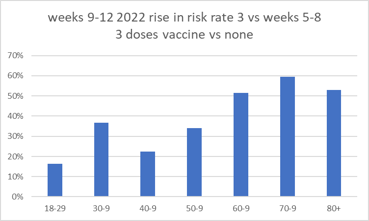 every single bracket is worse off under 3 doses in weeks 5-8 2022 than under 2 in weeks 49-52 in 2021. this really started to take off in march with risk rates rising by large amounts, especially in higher age brackets which saw increases in excess of 50% from just one month to the next.