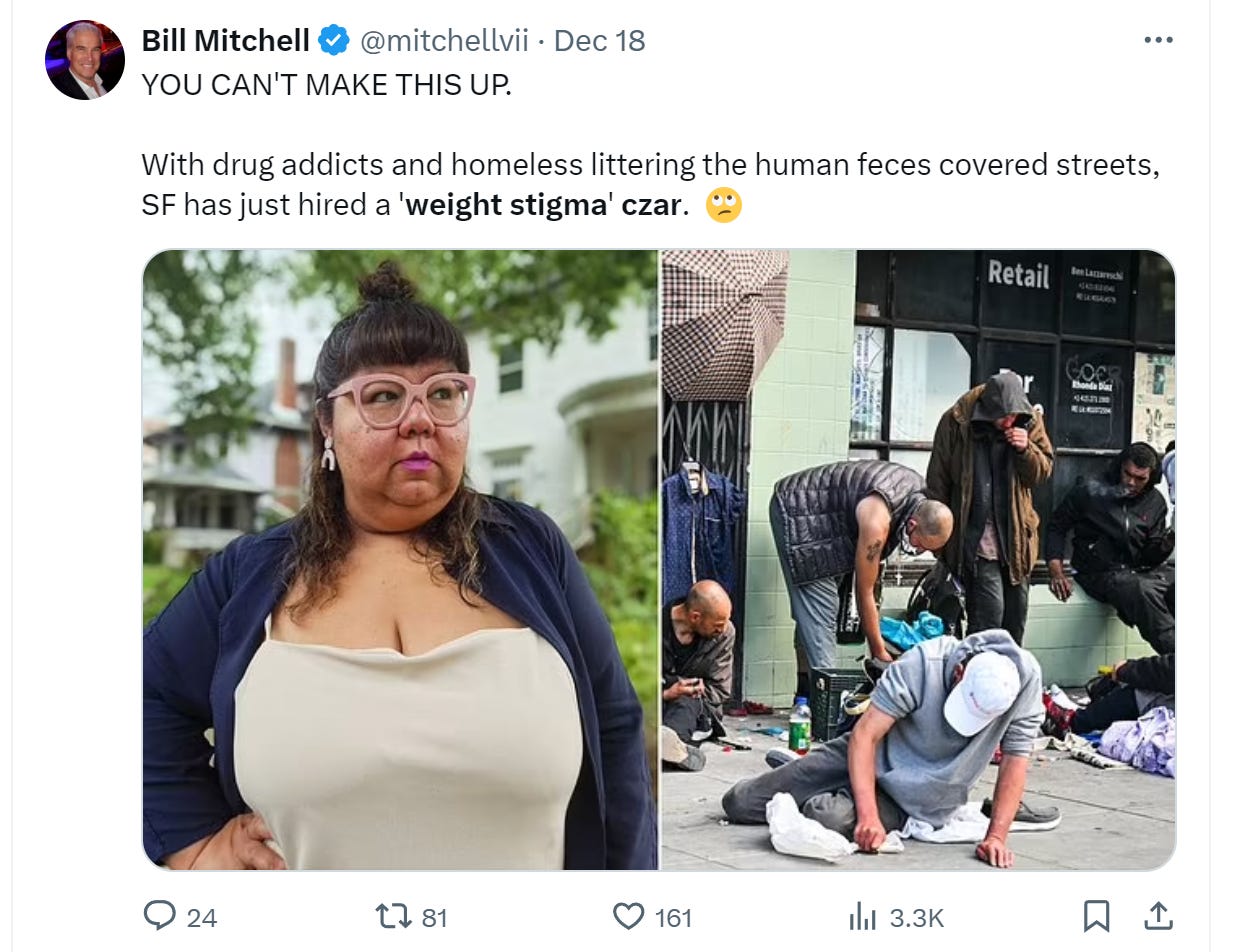 meet virgie tovar, who i swear is a real person, not joking, and has an actual government position working for san francisco as its “weight stigma czar.” this woman is the uncontested actual avatar of the ostentatiously insane narcissism complex seeking to intrude upon all norms and sense to violate them as some sort of self-aggrandizing power play of broken bossypants bullshittery.