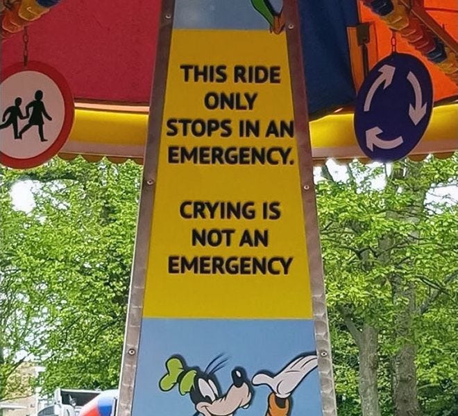 what if we create the opposite rights structure? what if, instead, crying IS an emergency and the ride will be instantly stopped every time some kid has a meltdown or gets scared or wets themselves?