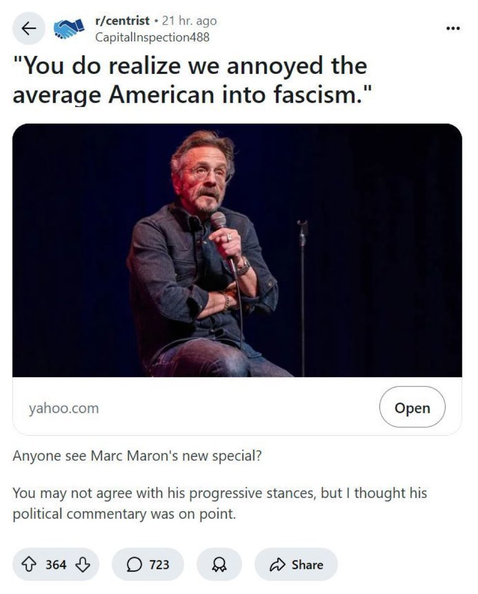 the left winds up seeing all of “the right” as extremists both because of its own shift to extreme positions being mistaken for movement of the other side and because only the most extreme of the right is willing to speak to them. they see it as some small fringe group of non-representative individuals.