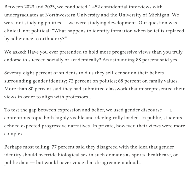 you can see this in the studies above. the students are not nearly as "left leaning" as they publicly profess. they just do it to "go along to get along" because they think everyone else is far left (because those are the only views spoken aloud) and the professors demand it as regurgitated doctrine in exams and papers and deans impose it as dormspeech.