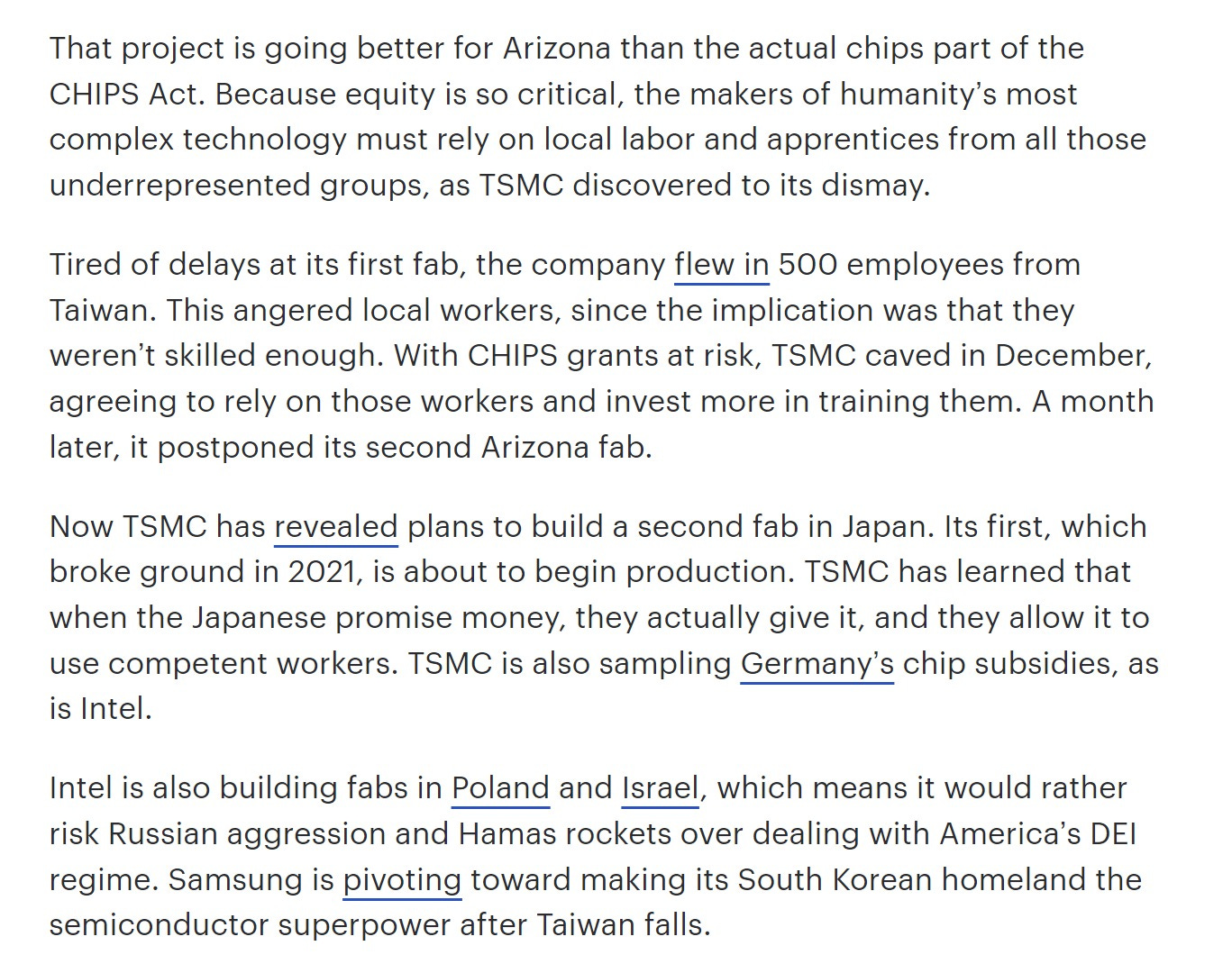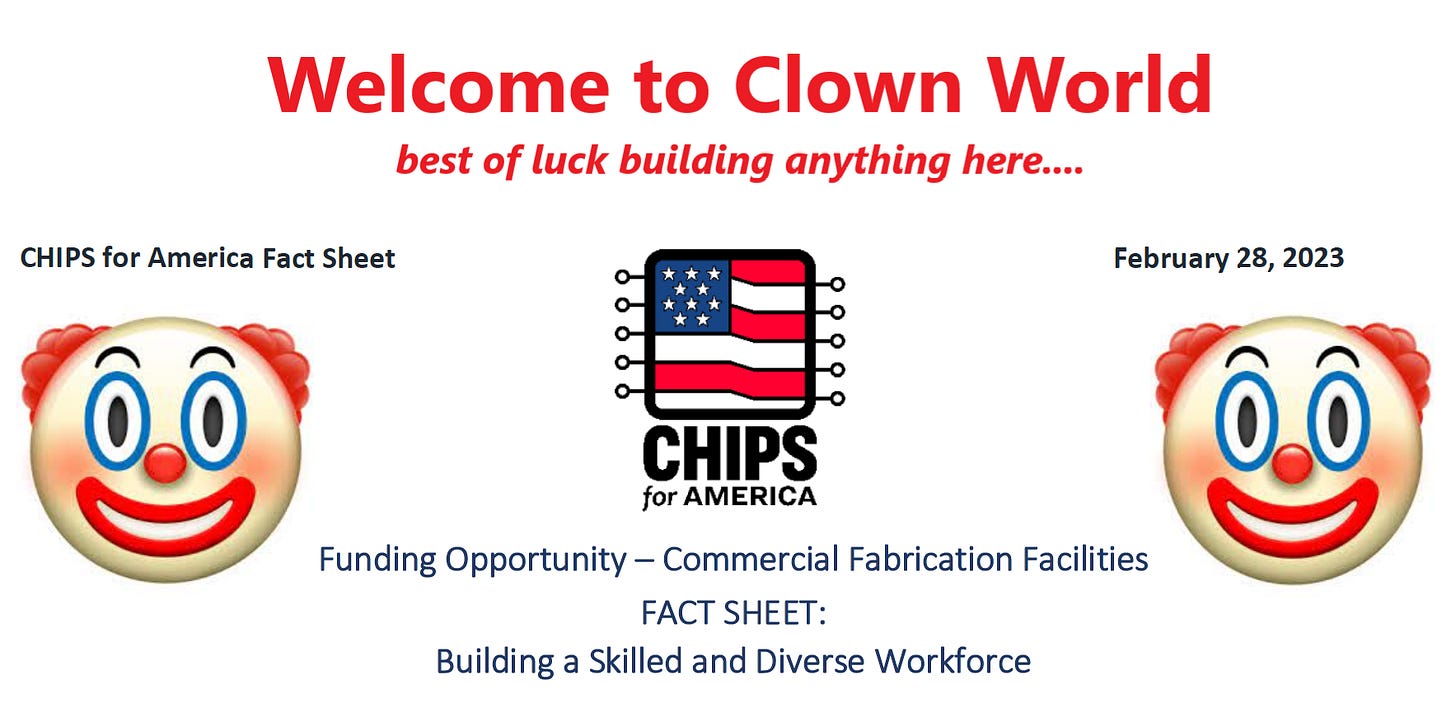 in a move akin to a 4th grade little league team forgoing pizza and ice cream after the game, intel and the major asian manufacturers are literally saying “no thanks” to $50 billion in funding to build US fabs because the money comes with diversity strings and they know that this will be death for them. (fact sheet)