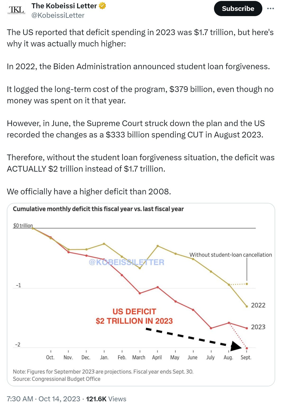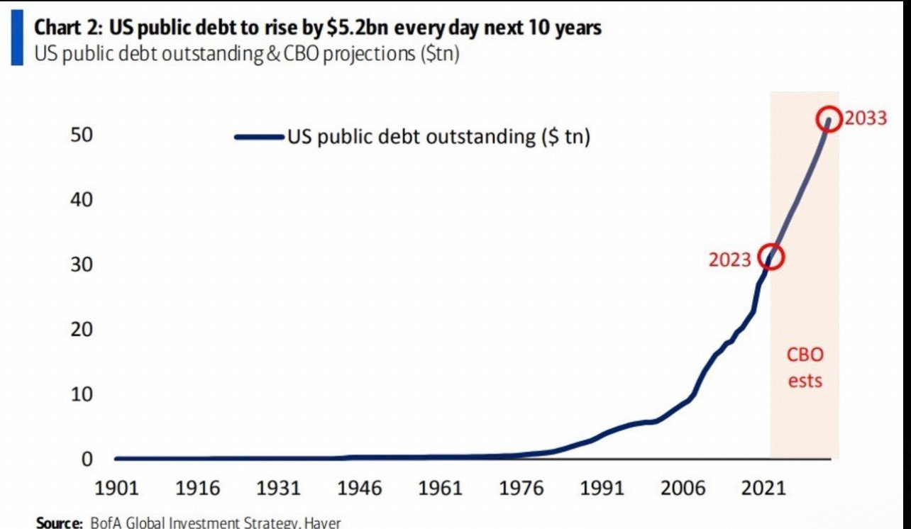 US debt was $5tn in 2007. it’s $33.75tn today. the CBO estimates we’ll be adding ~$20tn over the next 10 years. this seems optimistic. their “$5.2bn/day” estimate has been multiples low since the debt ceiling limit was raised. the real number has been $30bn/day, ~$1tn a month. $2tn a year on deficits seems low even if we don’t have any more crises, esp if debt service alone exceeds $1tn/yr. add a crisis and that number could be $70-80tn, not 50.