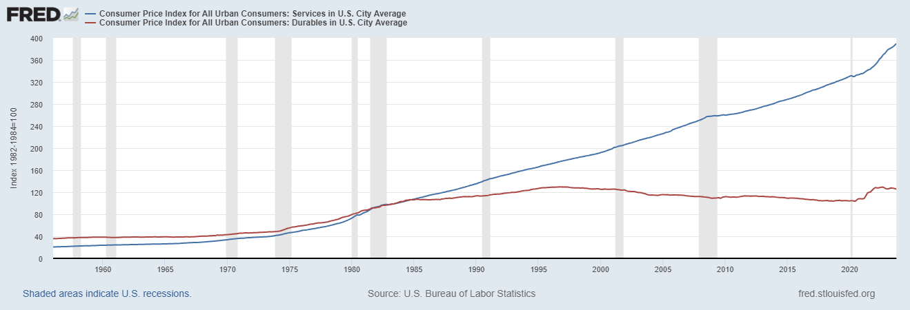 this has exploded US debt from already elevated levels to values that are truly problematic and this issue is being compounded by the historic spike in rates from the artificially suppressed near zero values of recent decades to levels more in keeping with historical norms and make no mistake, these are norms. it was ZIRP that was the aberration and it’s not coming back. rates that low could only persist without setting off massive inflation because of the outlandish overcapacity of china suppressing world prices for consumer and durable goods. so long as they were willing to sell below cost, there was basically no monetary policy rash enough to cause the price of a set of lawn furniture to rise. it kept dropping relentlessly as deflation reigned. it was astonishingly clear in the data as was the divergence from services (which were not affected by this trend).
