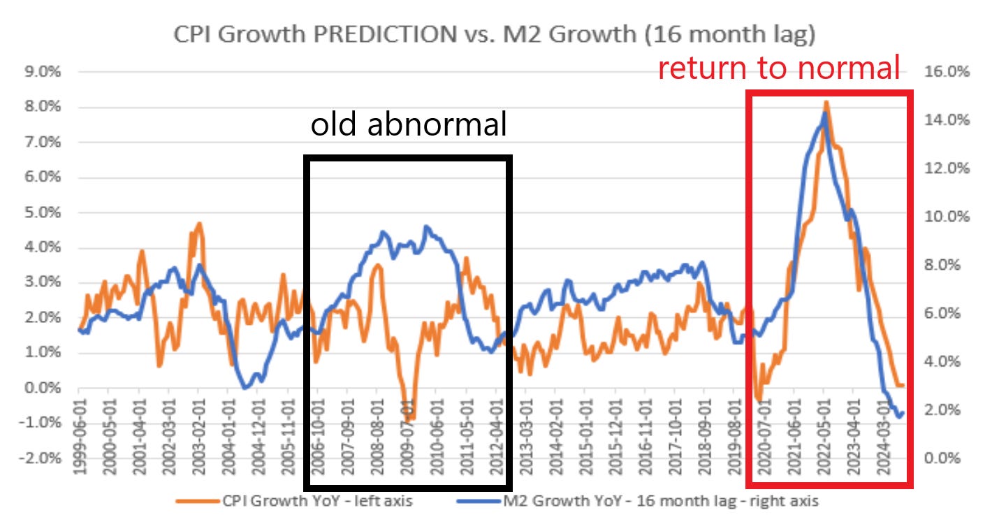 if we take CPI and compare to M2 (a measure of money supply) 16 months prior by shifting M2, we can see this: