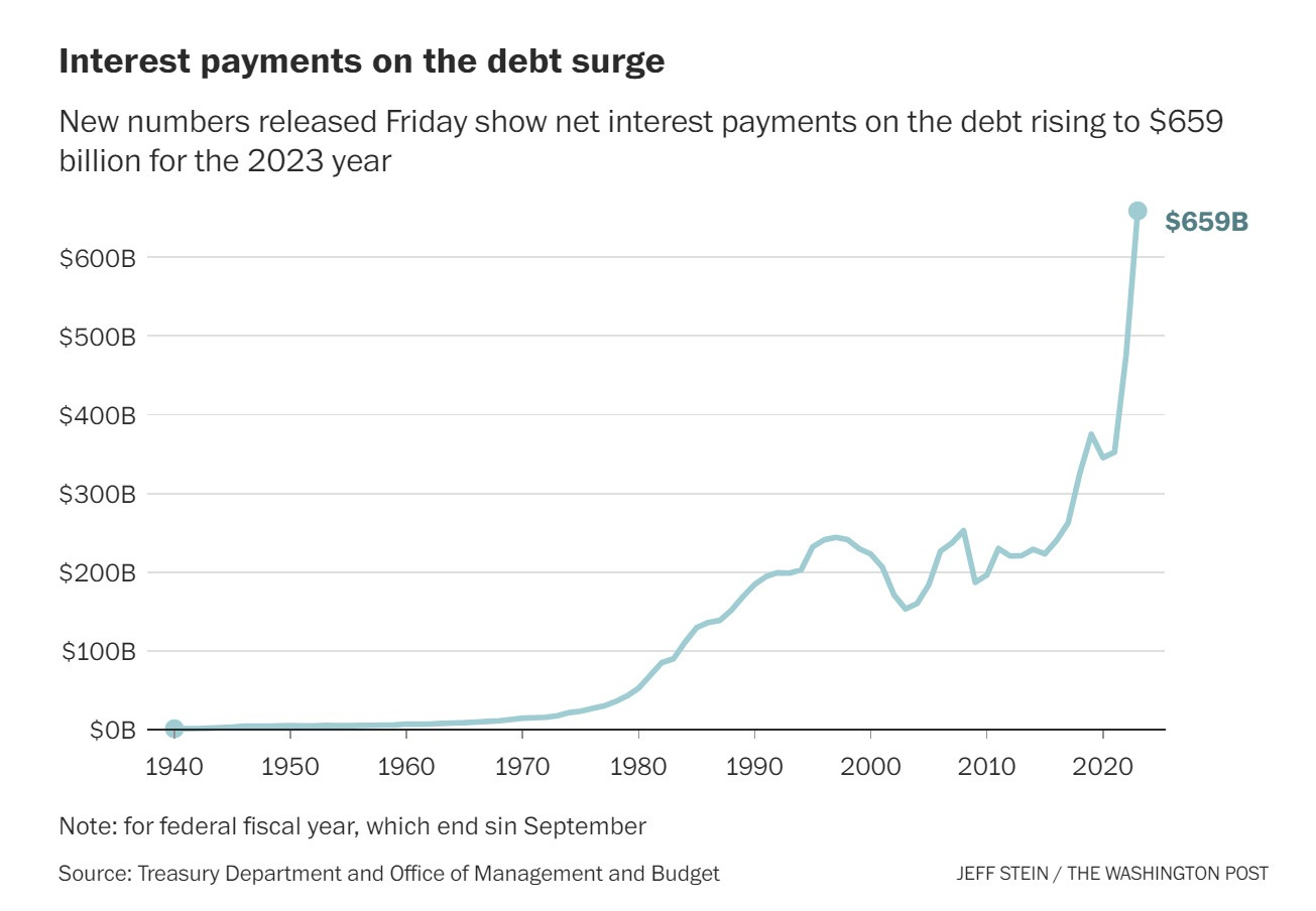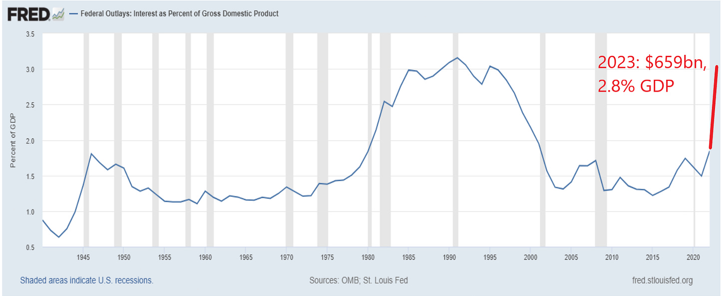 this could be ignored when rates were near zero because the costs were hidden. but now they are not. rates rose from 0.1% to well over 5%. and the US debt is quite short in terms of duration. $7.6 trillion of US debt matures over the next 12 months. (~31% of all debt outstanding) add to that the deficits and we likely need to sell $9-$9.5tn in debt in 2024. doopsie. and our policy makers seem to be either in severe denial about what’s going on or simply willing to lie bald-faced about it for political purpose. neither instills confidence.
