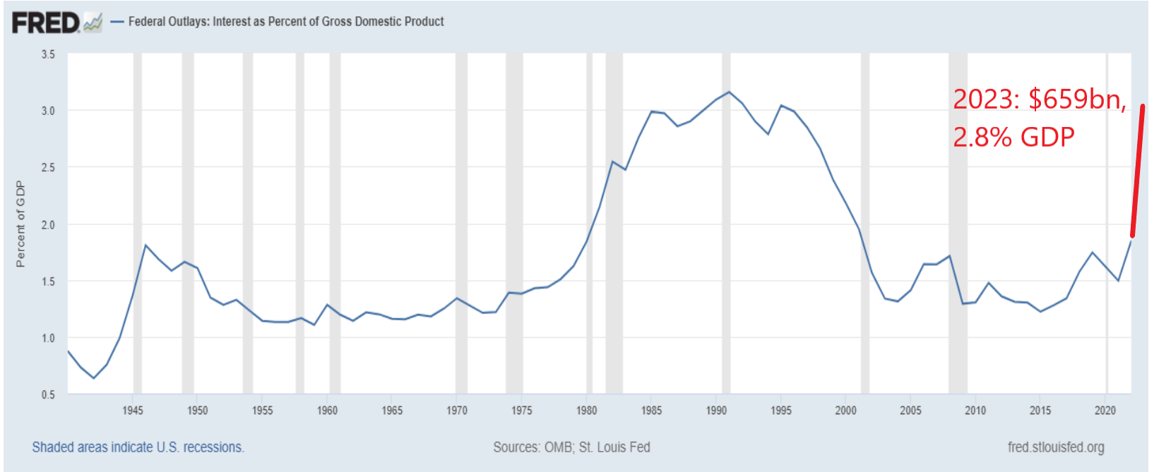 and this is not even bad yet. this is a cost of capital in the low 2%’s. as this rate rises toward 4 or 5%, this is going to double just on our existing debt. you can see it here as a % of GDP. at 4-5% rates, this would be 6 or 7% of GDP.