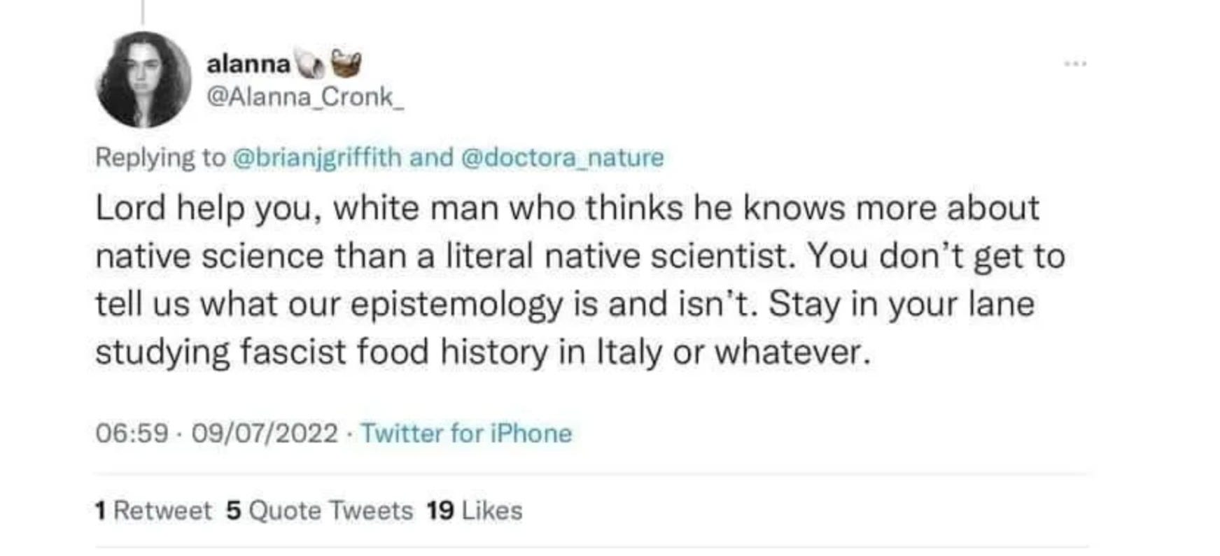 this is what may be charitably be called “a conflagration of warning signs.” it’s a complete subsumation into “ideology as identity” and validation as value. this is a woman with a single prism whose life has become a one note flute of repetitive application of “my knowing is bigger than your knowing “because indigenous”!”