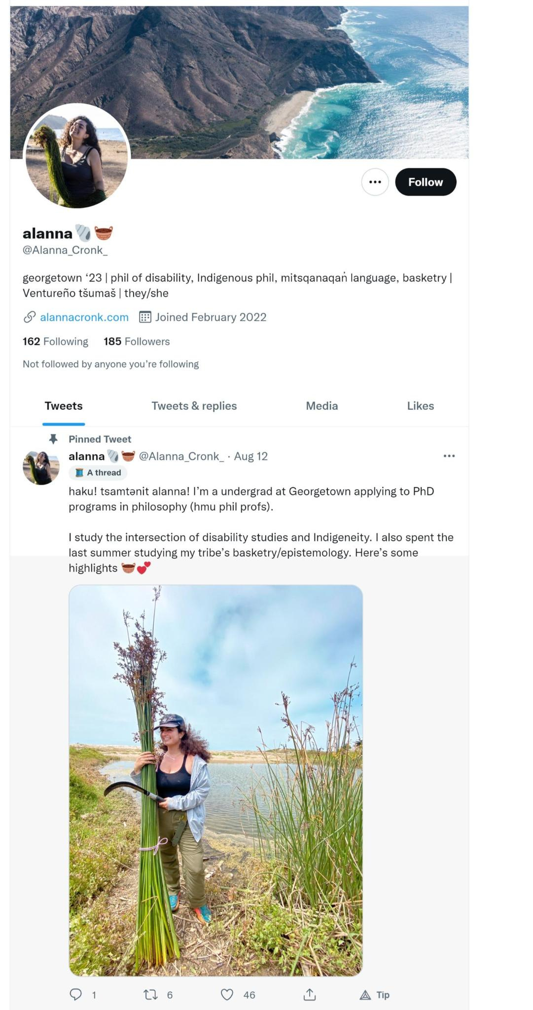 (it’s temping to assume that this is a parody account, but it’s not. go read the feed. they/she is really into basketry as epistemology as she unironically uses the metal blade of the colonizer to sever the noble reeds of her purported people)