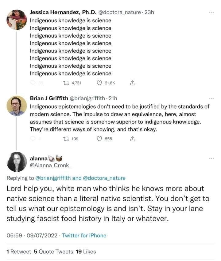 it is also a WILD and direct denial of science. i have no idea what “indigenous science” is supposed to mean exactly, but a perusal of her website makes it appear to mean “a massive hodge podge of non-unified and non validated superstition and values ascription possessing no empirical or even logical basis” leavened with appeals to credentialism.