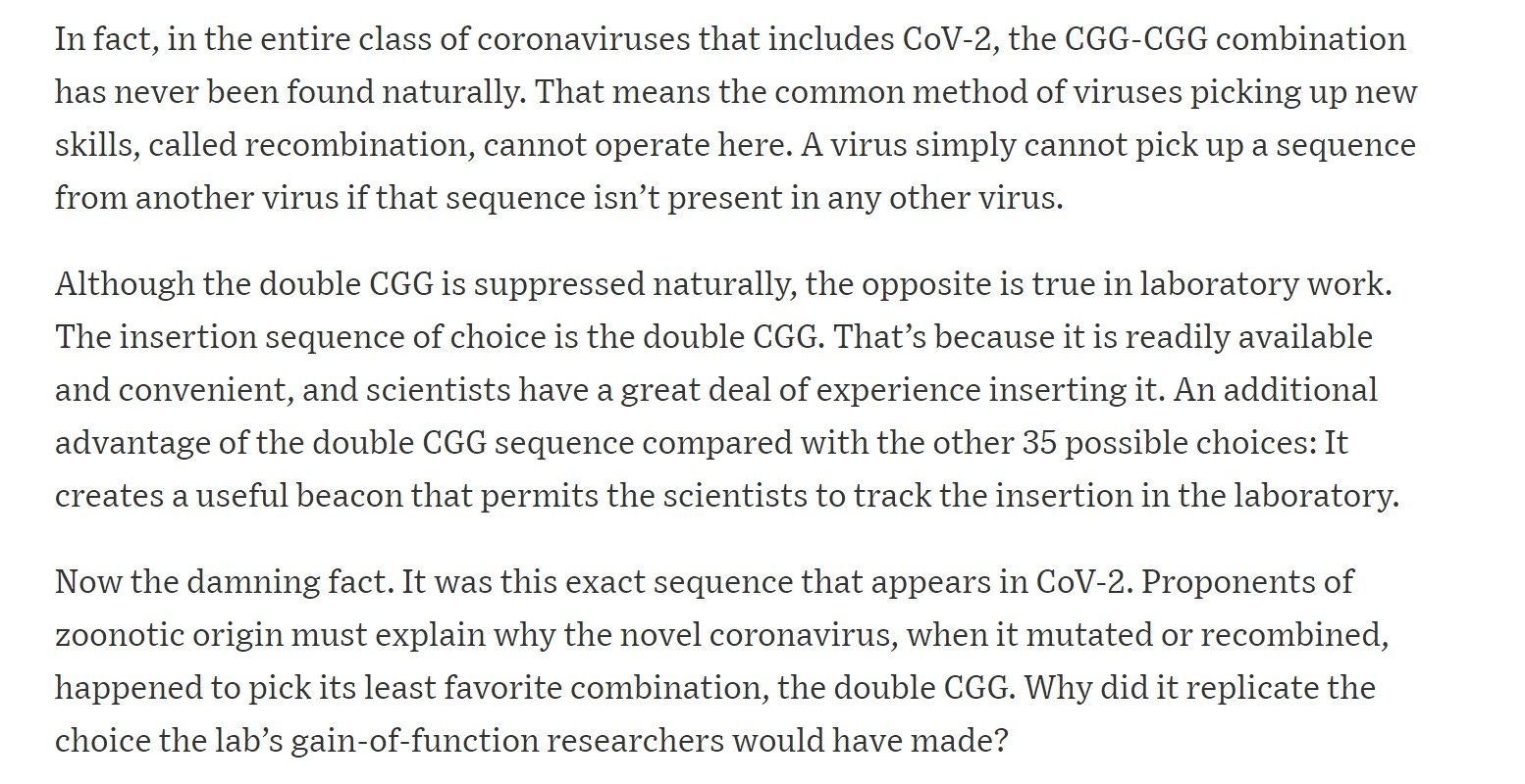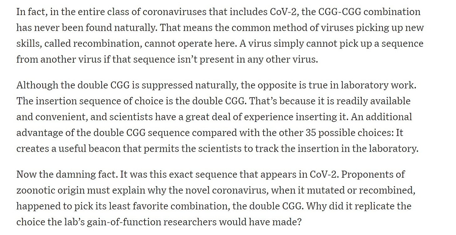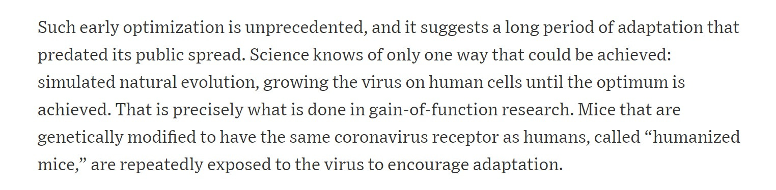 additionally, (again, presuming this is true) the speed of vaccine development would seem to bolster the case for a lab escape origin theory as it’s easier to develop if you’re already familiar with the virus and the alterations.
