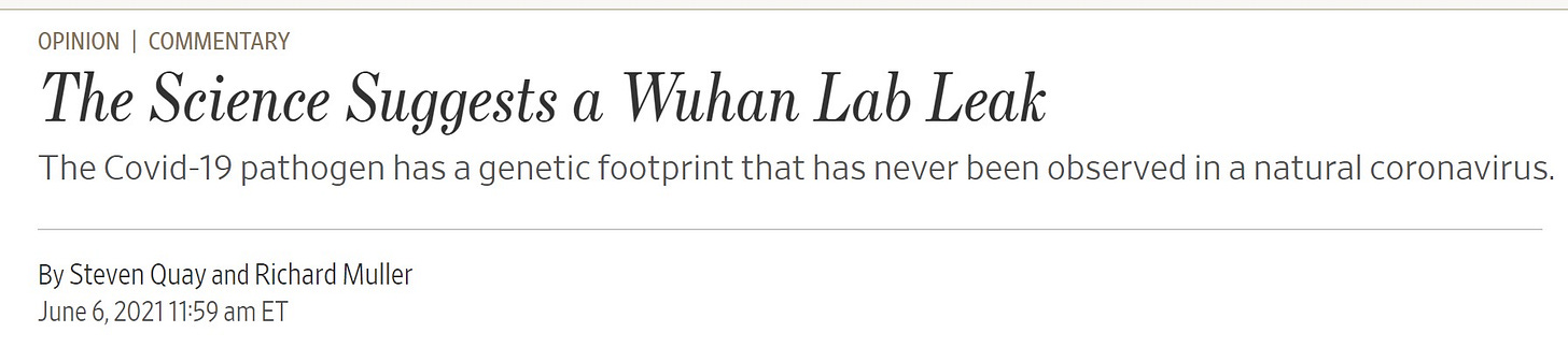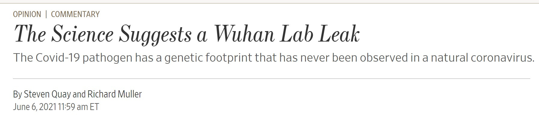 the issue is that we’re never likely to have a full blown “smoking gun” like a whistleblower or some scientist that comes forward to talk about getting splattered with blood or seeing infected animals mishandled. it’s china and it’s been 15-18 months. that ship long since sailed, was sunk, and hidden in an uncharted sea trench.