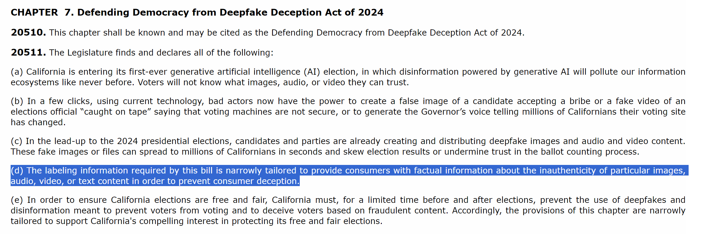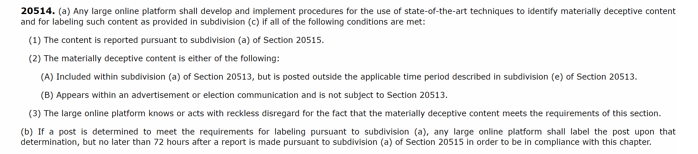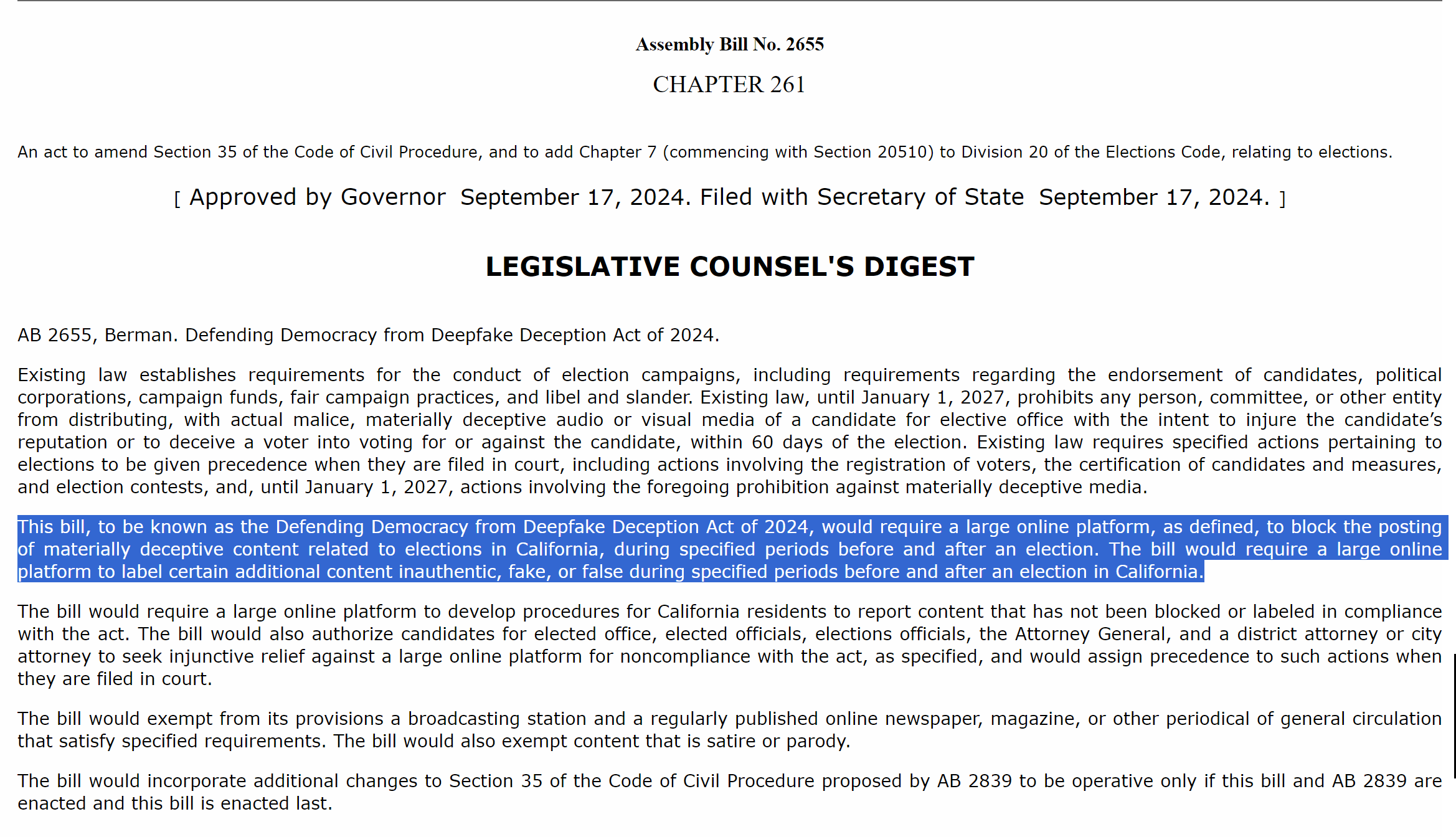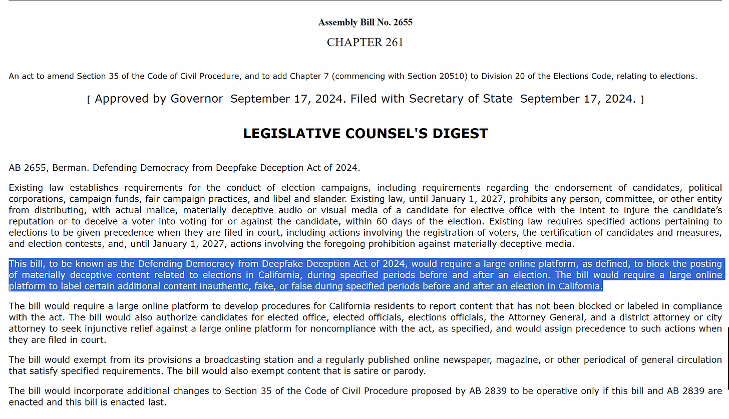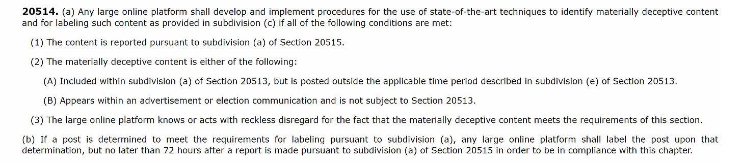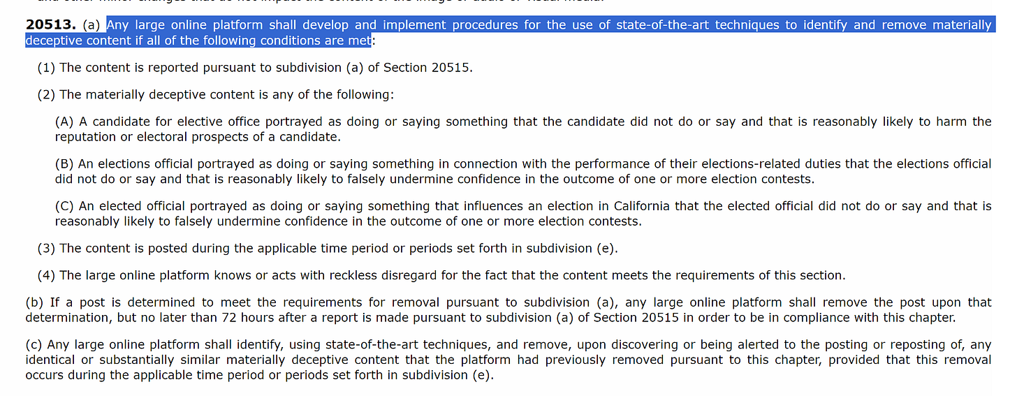 the meat of this bill is that it requires online platforms to “block the posting of materially deceptive content related to elections in California, during specified periods before and after an election.” and/or mark it as inauthentic