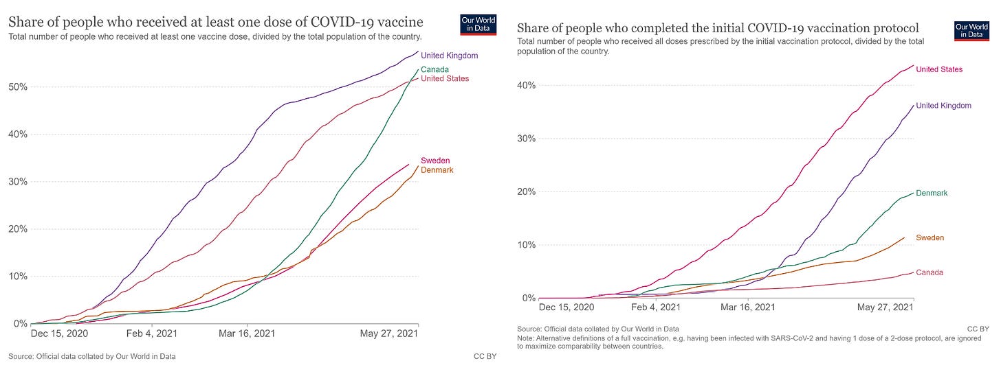 it occurred to be that something of a natural experiment along with something of a natural control group was available and that, while this is clearly not gold standard RCT level data it ought to be good enough to pick up a signal if the vaccines are anything like these massive efficacy levels of 85%+ that models have been presuming or the near total “death preventative” that folks like ashish jha have been claiming from their public health perches.