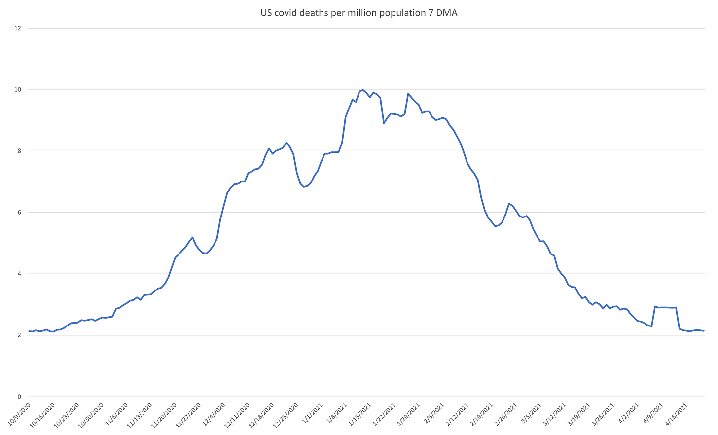 leaving out what looks like a data artifact in the back side series, the 45 days from 10/6/20 are basically indistinguishable from the 45 days ending 4/22/21 despite ~1/3 of the full US population and basically all the vulnerable being fully vaxxed in the second period.
