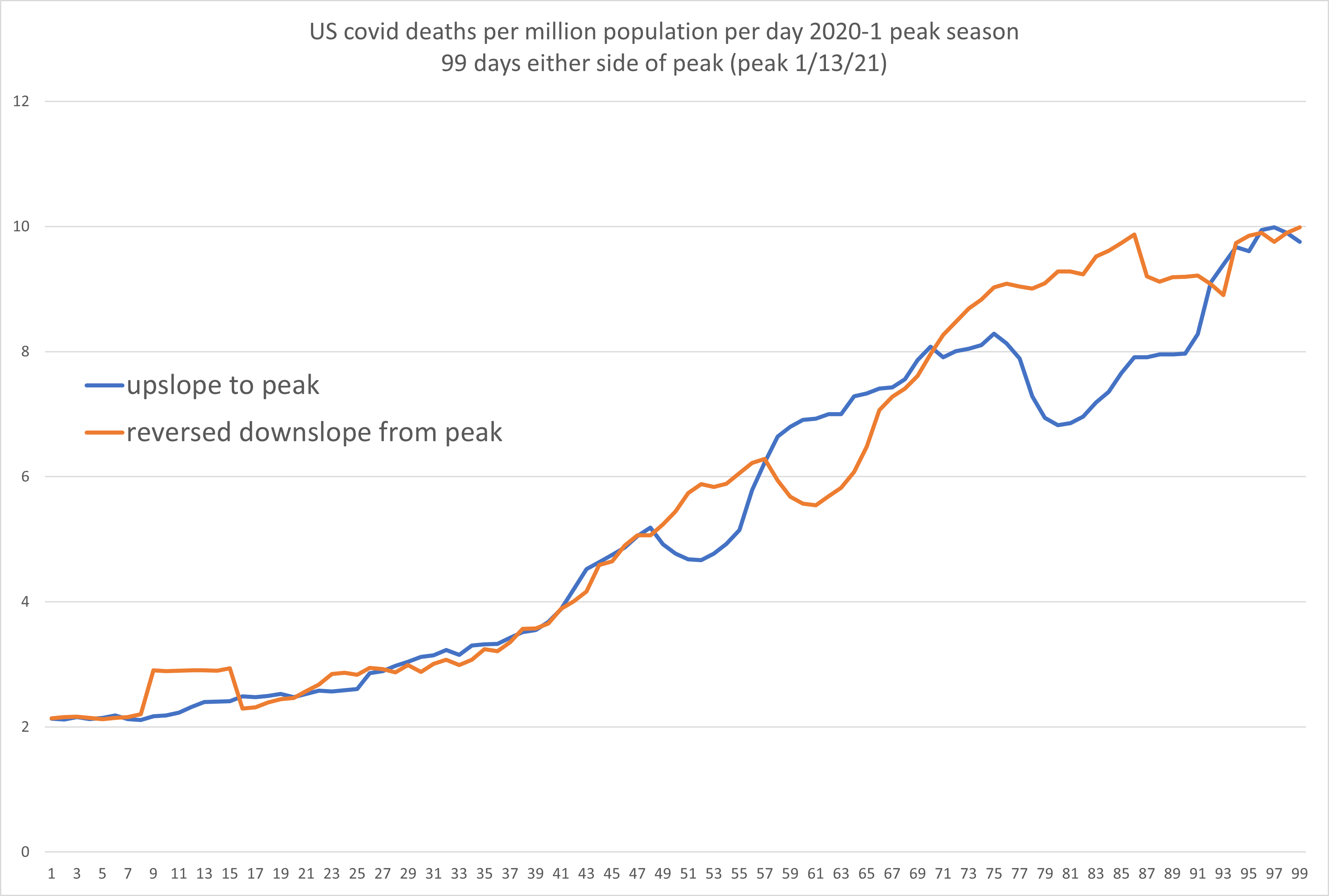 volume under curve is notoriously difficult to eyeball, so i calculated it using variance in cumulative deaths. overall, the back side of the curve was, peak to 99 days post 1.78% smaller than the 99 days pre-peak.