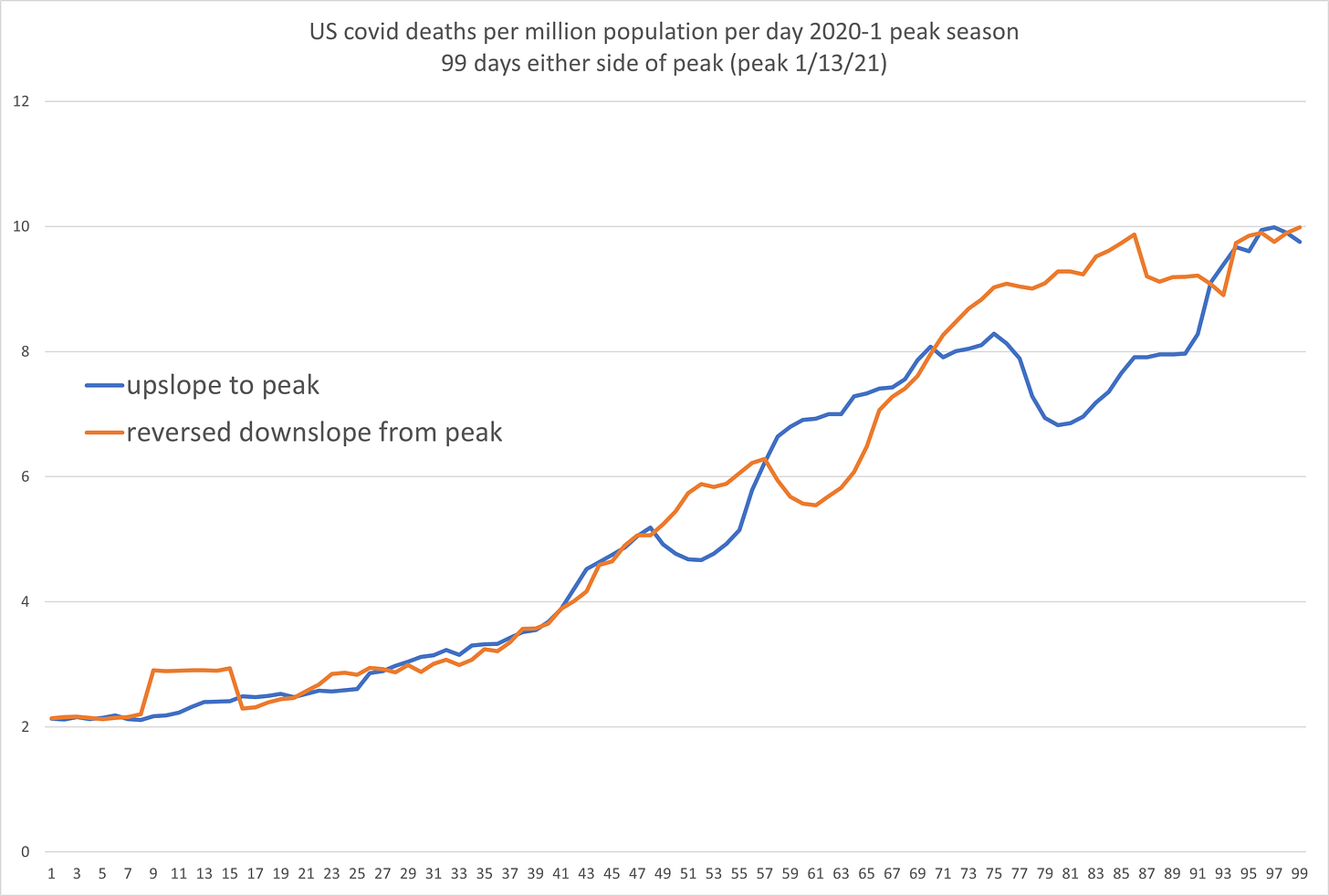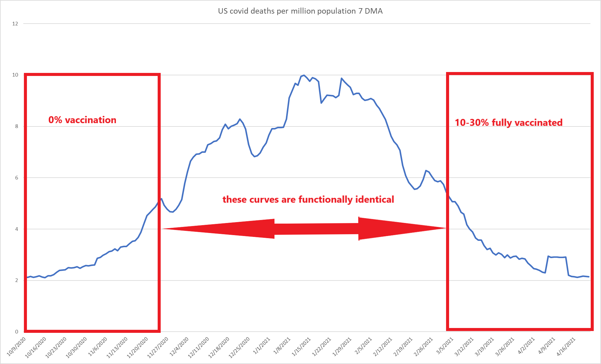 the front side if the curve to viral peak had no vaccines. the curve down did and while their application was still somewhat low, they were highly focused in the highest risk populations. if their efficacy is anything like claimed even this number applied to the high death expectation cohorts should provide some sort of “curve bending” where deaths post peak look better than those before.